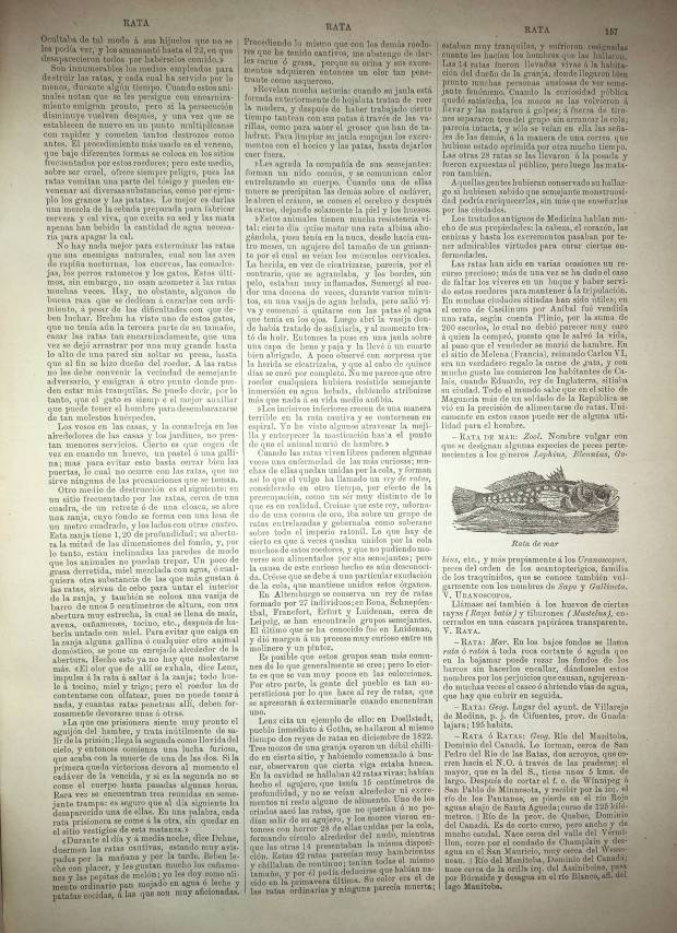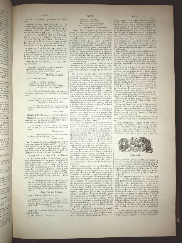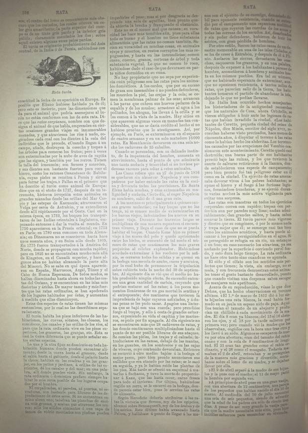 Busqué el tomo donde estaba la entrada dedicada a la rata. Estaba en el tomo decimoséptimo. Después de leerlo por encima, me pareció de interés. Así que, esquivando la mirada del librero, tomé unas fotografías de las páginas 155, 156 y 157. Me ha parecido que valía la pena transcribirlo respetando la ortografía de la época y compartirlo. No es un artículo bueno, pero se encuentran datos curiosos. Está trufado de historias entretenidas. Se describen las dos especies de ratas sinantrópicas como la rata ordinaria (Mus rattus) y la rata turón (Mus decumanus). No es la primera vez que encuentro el término turón para referirse a Rattus norvegicus en textos antiguos. Se indica que no se sabe cuándo fue introducida en España.