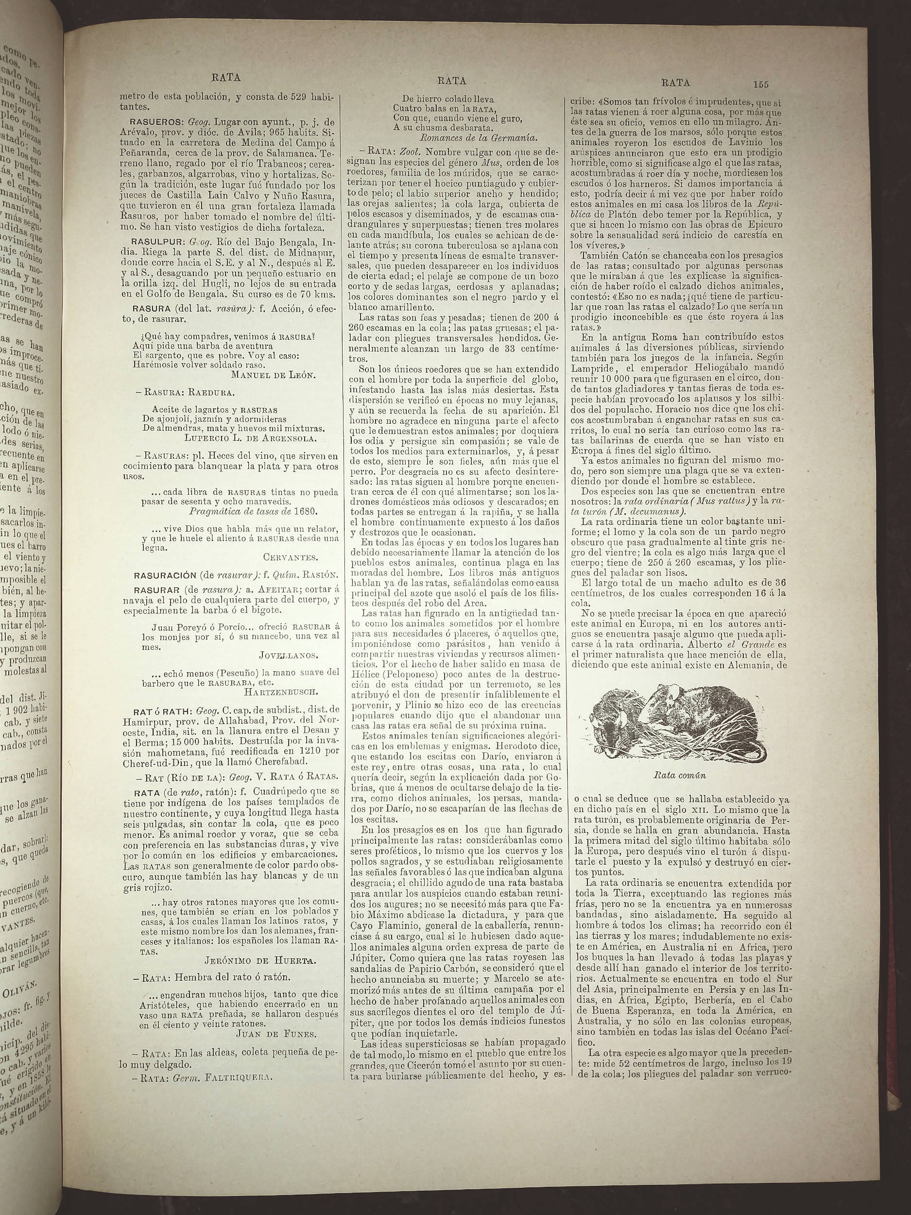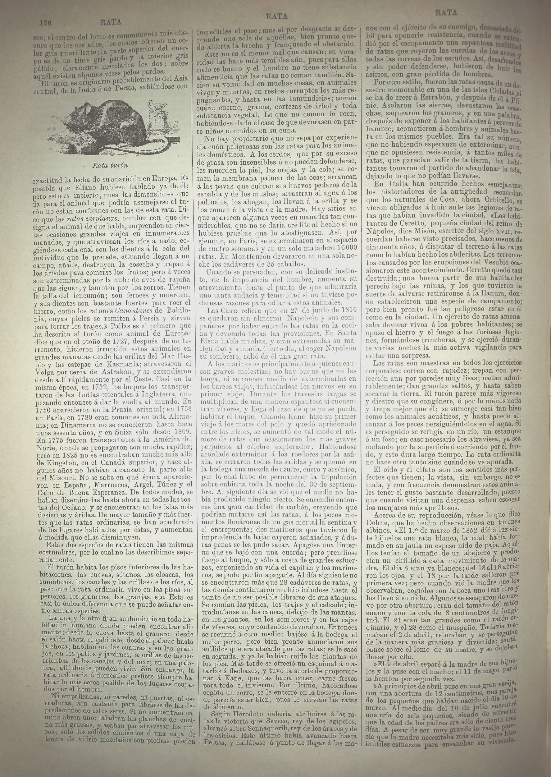 Busqué el tomo donde estaba la entrada dedicada a la rata. Estaba en el tomo decimoséptimo. Después de leerlo por encima, me pareció de interés. Así que, esquivando la mirada del librero, tomé unas fotografías de las páginas 155, 156 y 157. Me ha parecido que valía la pena transcribirlo respetando la ortografía de la época y compartirlo. No es un artículo bueno, pero se encuentran datos curiosos. Está trufado de historias entretenidas. Se describen las dos especies de ratas sinantrópicas como la rata ordinaria (Mus rattus) y la rata turón (Mus decumanus). No es la primera vez que encuentro el término turón para referirse a Rattus norvegicus en textos antiguos. Se indica que no se sabe cuándo fue introducida en España.