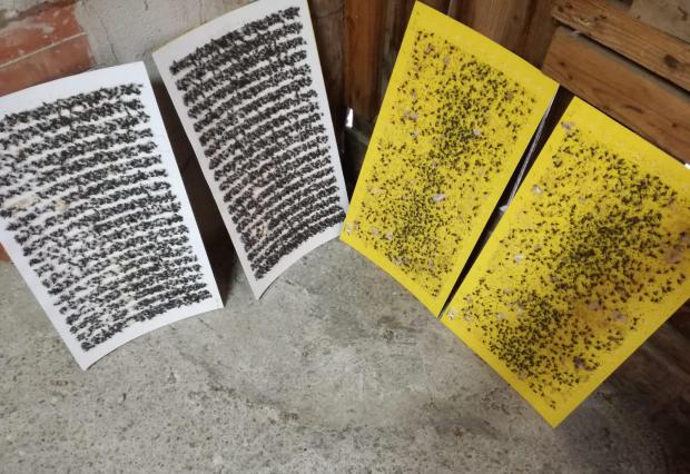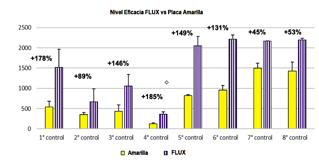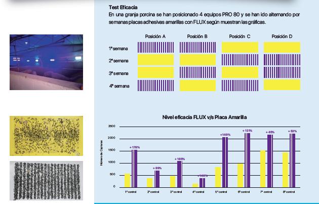 La tabla Flux ha sido puesta a prueba. Ekommerce ha dado a conocer los resultados de una prueba de eficacia realizada en una granja porcina en Italia, donde ha sido desarrollado el producto (figura 3). Para ello se utilizaron cuatro insectocaptores Pro 80 en los que se han confrontado dos series. Por un lado, han alternado tablas amarillas y Flux (figura 4). Y por otro, tablas amarillas y negras (figura 5). Según se puede observar, las capturas de la tabla Flux son superiores respecto a las amarillas. Y si se tiene en cuenta las tablas negras, son todavía más eficaces. Hemos de confiar en que el estudio de eficacia se ha realizado correctamente y esta nueva tabla representa un importante avance. No estaría de más saber con qué especies es más eficaz para tenerlo en cuenta en determinadas situaciones.