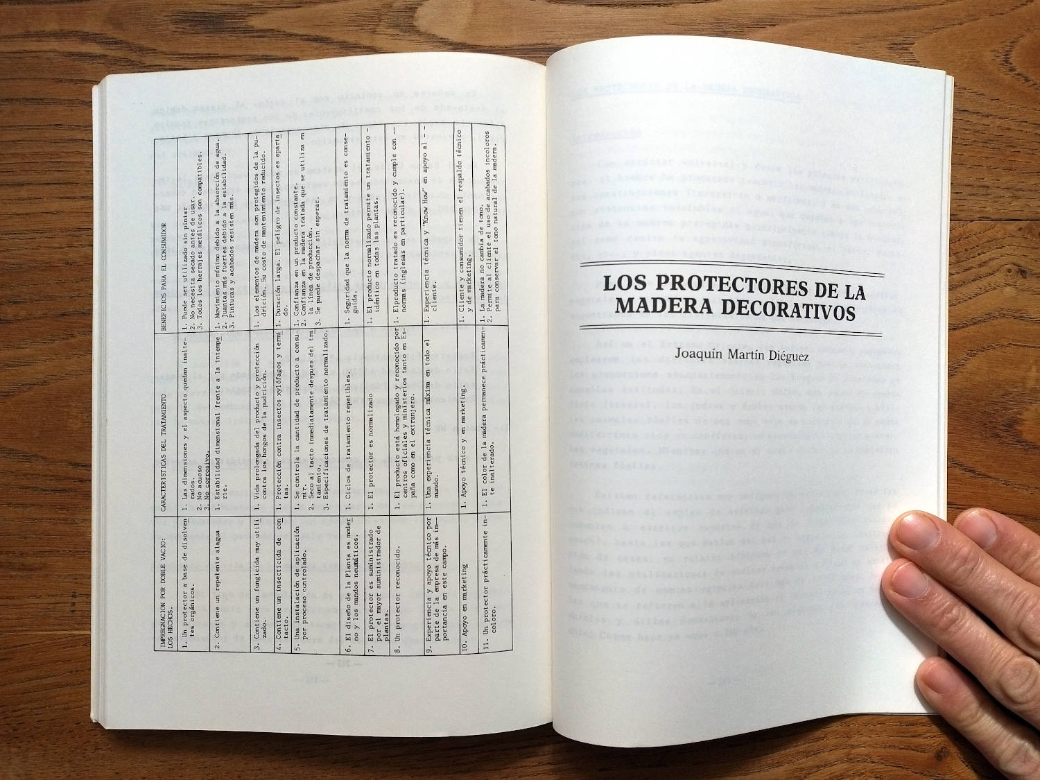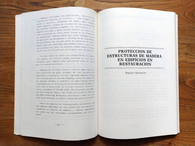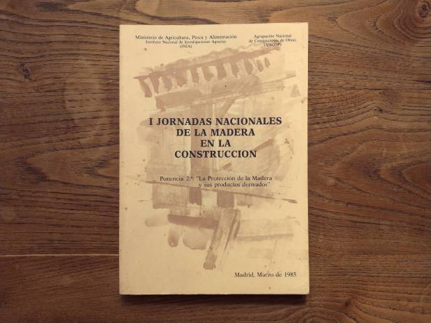 Encontré un viejo volumen que recoge las exposiciones sobre protección de la madera en el marco de las ‘Primeras Jornadas Nacionales de la Madera en la Construcción’ (figura 1). Estas jornadas transcurrieron entre el 6 y el 8 de marzo de 1985 en Madrid. Fueron organizadas por el Instituto Nacional de Investigaciones Agrarias (INIA), organismo dependiente del Ministerio de Agricultura, y la Agrupación Nacional de Constructores de Obras (ANCOP). Las diversas temáticas fueron agrupadas en seis ponencias: madera y construcción, protección de la madera, comportamiento al fuego, tendencias actuales en la construcción en madera, madera en la rehabilitación y restauración de edificios, legislación y normativa para uso en la construcción [1].