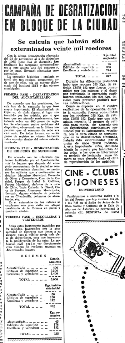 Veamos unos datos de la campaña realizada en Gijón entre el 23 de noviembre y el 4 de diciembre de 1965. Esta desratización fue descrita en detalle en un artículo titulado ‘Campaña de desratización en bloque de la ciudad’ publicado en el periódico ‘El Comercio’ el 21 de enero de 1966 (figura 7). Esta campaña fue la quinta realizada por el Instituto IBYS, siendo la primera en 1960 entre el 22 de junio al 9 de julio de la cual se puede ver una fotografía arriba (figura 1). La de finales de 1965 duró 12 días y fue llevada a cabo por «tres equipos, compuestos, cada uno de ellos, por un experto diplomado del Instituto IBYS y dos obreros municipales». Hasta mediados de la década de 1960 era necesario que quienes trabajaran en desinfección, desinsectación y desratización (DDD) pasaran un curso de la Dirección General de Sanidad. Posteriormente, fue derogada la normativa DDD hasta la llegada del Real Decreto 3349/1983 (Reglamentación Técnico-Sanitaria para la fabricación, comercialización y utilización de plaguicidas).