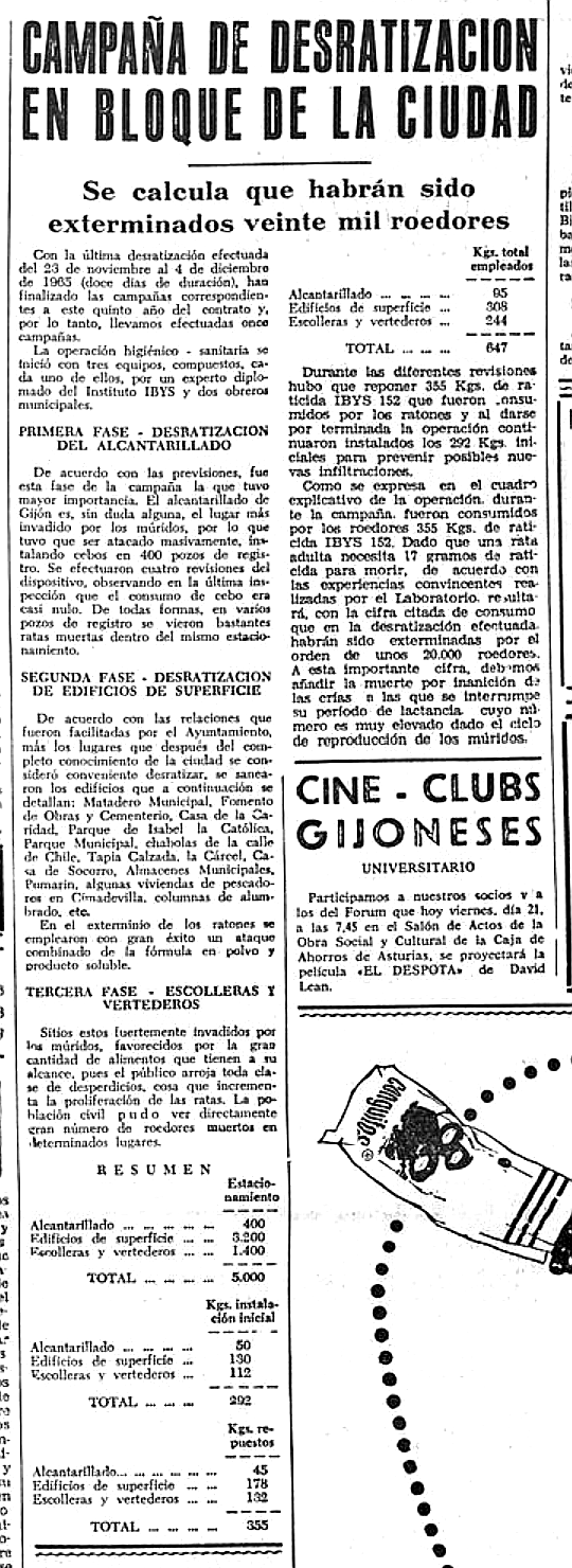 Veamos unos datos de la campaña realizada en Gijón entre el 23 de noviembre y el 4 de diciembre de 1965. Esta desratización fue descrita en detalle en un artículo titulado ‘Campaña de desratización en bloque de la ciudad’ publicado en el periódico ‘El Comercio’ el 21 de enero de 1966 (figura 7). Esta campaña fue la quinta realizada por el Instituto IBYS, siendo la primera en 1960 entre el 22 de junio al 9 de julio de la cual se puede ver una fotografía arriba (figura 1). La de finales de 1965 duró 12 días y fue llevada a cabo por «tres equipos, compuestos, cada uno de ellos, por un experto diplomado del Instituto IBYS y dos obreros municipales». Hasta mediados de la década de 1960 era necesario que quienes trabajaran en desinfección, desinsectación y desratización (DDD) pasaran un curso de la Dirección General de Sanidad. Posteriormente, fue derogada la normativa DDD hasta la llegada del Real Decreto 3349/1983 (Reglamentación Técnico-Sanitaria para la fabricación, comercialización y utilización de plaguicidas).