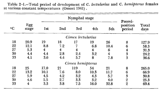 En primer lugar, me gustaría apuntar algunos datos sobre la distribución. C. lectularius parece proceder de la región paleártica, oriente Medio más en concreto, mientras C. hemipterus procede del sur de Asia, de la región indomalaya. A partir de estas zonas de origen, se habrían distribuido por todo el mundo. C. lectularius sería la especie que tendría mayor distribución, mientras que C. hemipterus estaría concentrada en las zonas tropicales. Para entender esto, vale la pena ver los datos de la tabla de la imagen número 4. Esta tabla aparece en el tratado sobre cimícidos que Robert L. Usinger publicó en 1966 y recoge el tiempo total que necesitan hembras de ambas especies para completar su ciclo de vida [3]. Para una temperatura ambiental de 18ºC, una hembra de C. lectularius se desarrolla en 127’9 días, mientras que una hembra de C. hemipterus necesita 265 días. Sin embargo, a temperaturas superiores, ambas especies tienen un tiempo de desarrollo muy parecido.