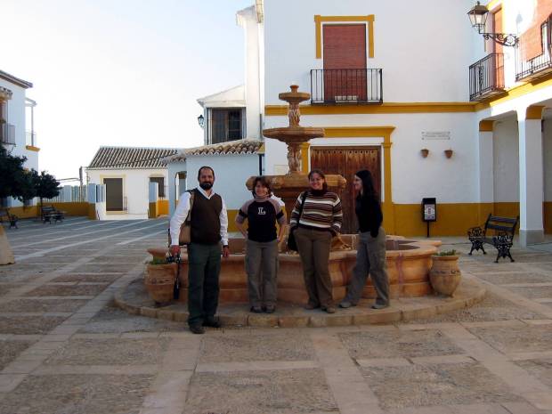 Fig 4. David Mora, Lidia Ariza, Eugenia Alcaide y Raquel en Palenciana (Córdoba) en 2004, primer casco urbano tratado con cebo contra termitas en España entre 1999 y 2001.