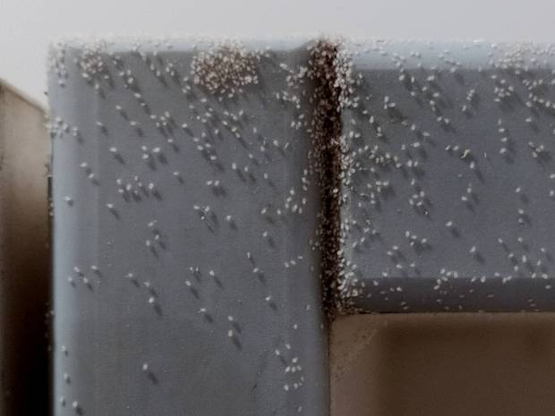 Por otra parte lo suyo es buscar el origen y tratar solo esa zona. Esto lo consigues con observación. Puedes tratar con un insecticida convencional, pero no funcionará. O bien con elementos desecantes como sílice o tierra de diatomeas en la zona. Esto es muy efectivo contra ácaros. Solo aplicado en la zona. Si realmente se trata de los ácaros de las imágenes, entonces son ácaros alimentarios. Su origen está en algún alimento humedecido. No hace falta que esté mojado, simplemente que haya tomado algo de humedad.
