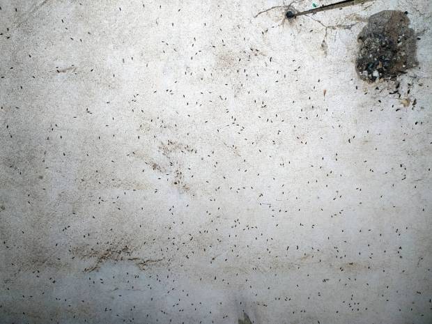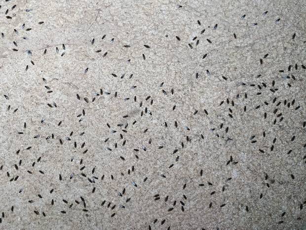 [3] C. Pradera. 30-09-2018. Mosca Drosophila (Drosophilidae) debajo de la tarima de un bar. El desinsectador y desratizador.