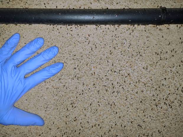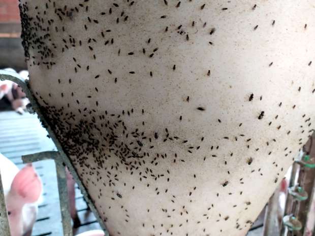Fig 13. Tolva de comedero con Drosophila (Drosophila) repleta y con alguna Musca domestica e Hydrotaea aenescens./ C. Pradera 08-2020