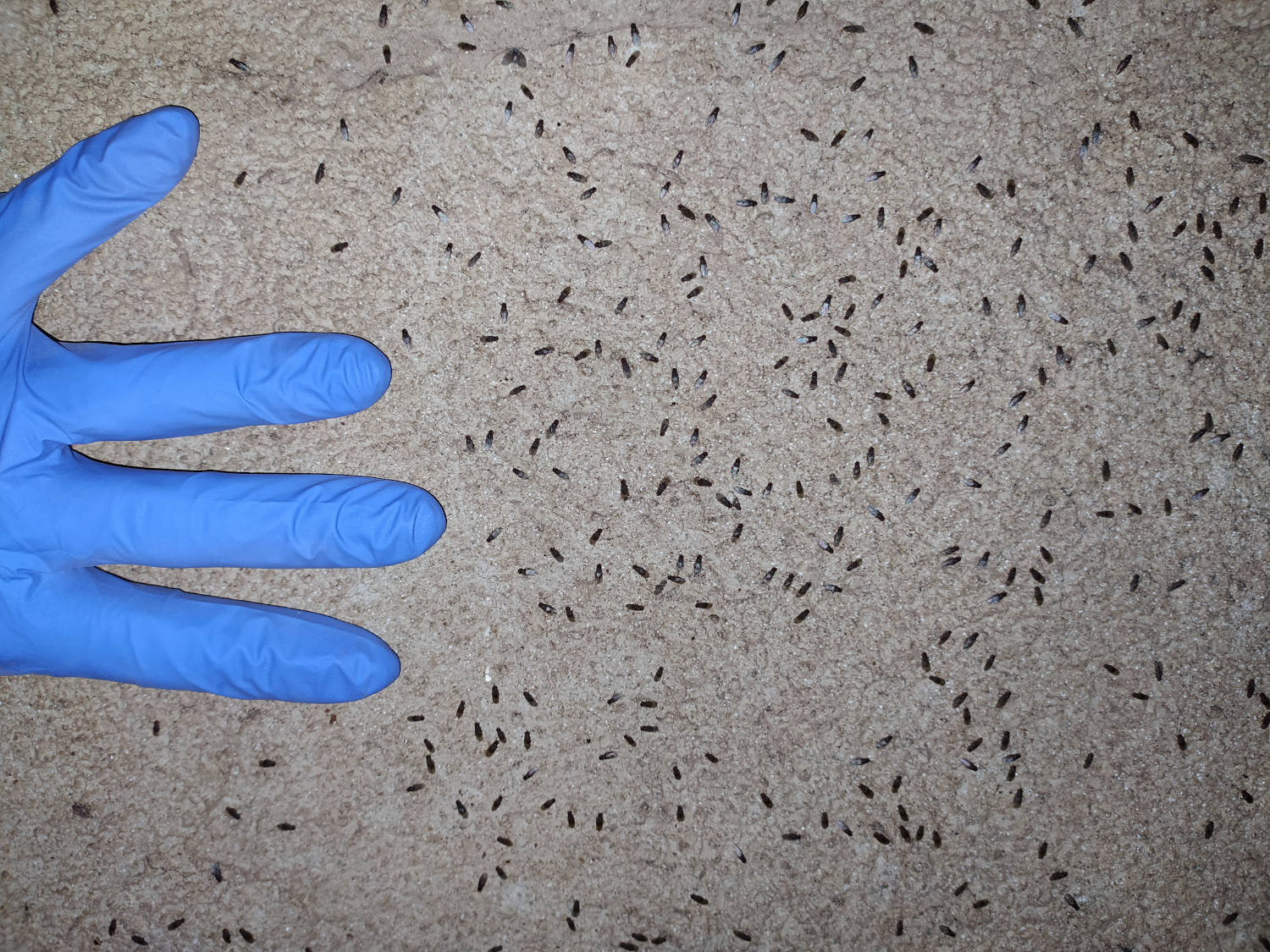 [3] C. Pradera. 30-09-2018. Mosca Drosophila (Drosophilidae) debajo de la tarima de un bar. El desinsectador y desratizador.