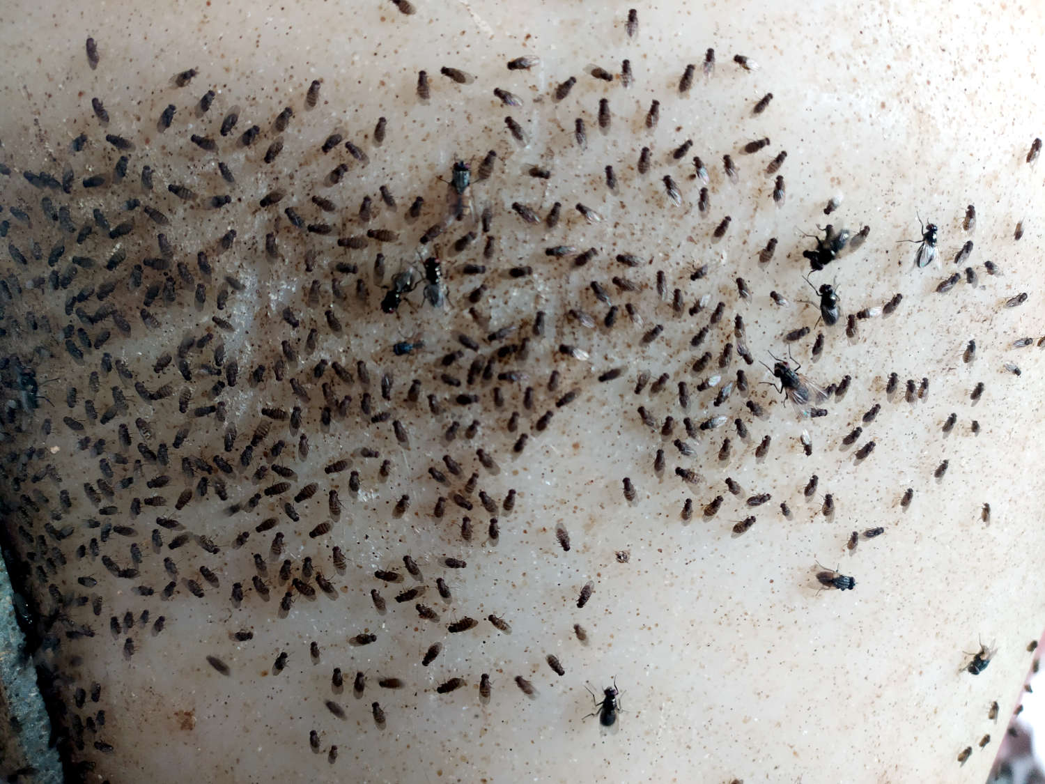 En las imágenes de esta entrada muestro una infestación de moscas del género Drosophila sobre paredes de granjas porcinas. A primera vista, puede parecer una fuerte infestación. Sin embargo, teniendo en cuenta el lugar es algo normal. El límite de tolerancia es alto y hay otras especies de mosca que resultan más problemáticas. Si esta infestación acaeciera en un bar o restaurante, sería un drama porque indicaría que el local no reúne las correctas condiciones higiénicas. Y por supuesto, a los clientes se les quitaría las ganas de acudir.