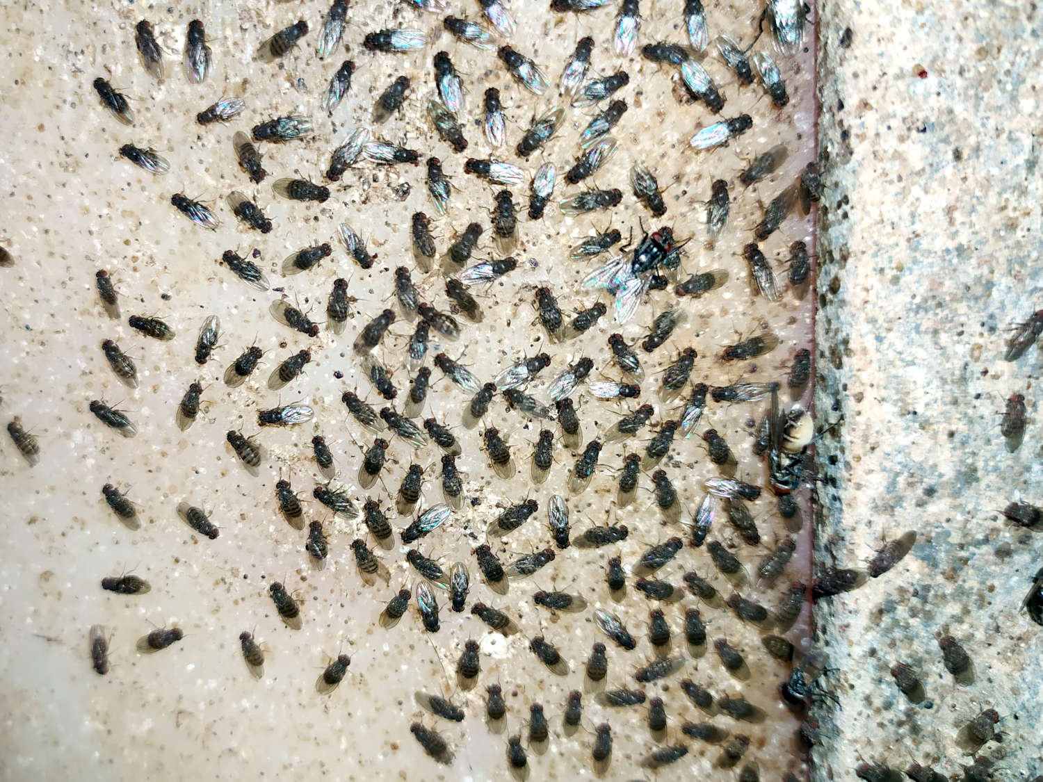 Fig 6. Pared con Drosophila (Drosophila) repleta y un individuo de Musca domestica./ C. Pradera 06-2020