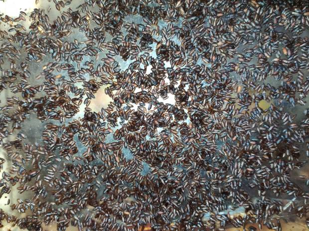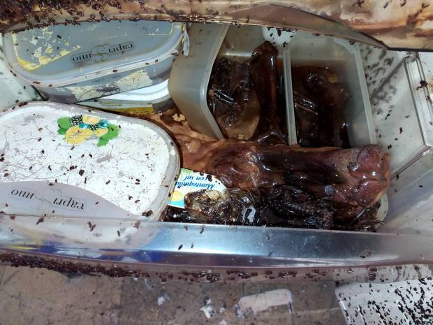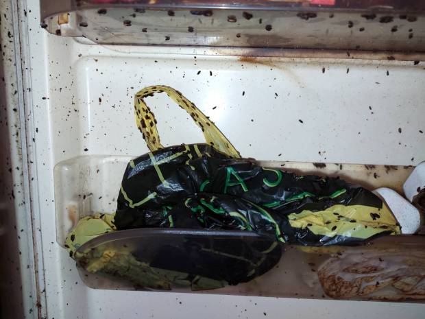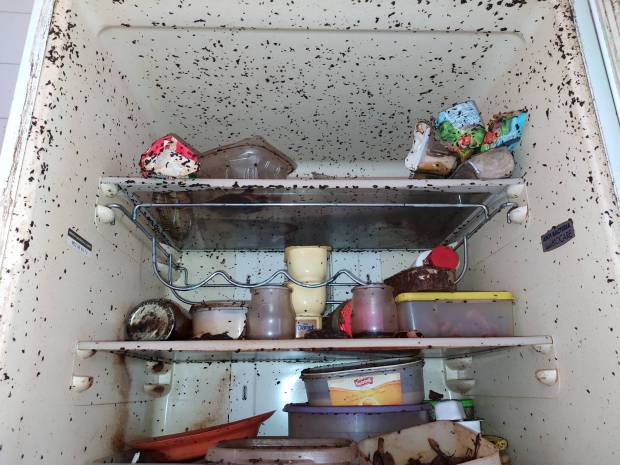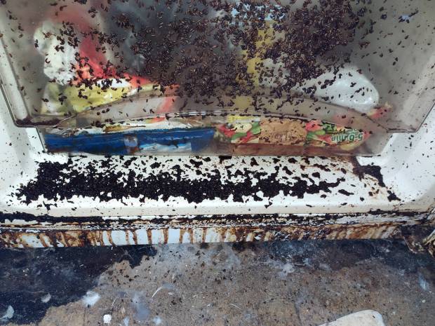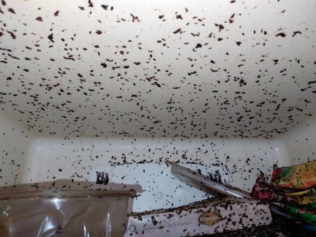 En esta entrada se pueden ver imágenes de una nevera que quedó llena de comida en un piso abandonado. Esto fue aprovechado por mosca jorobada (Megaselia) [1]. La comida en estado de descomposición creó una temperatura y humedad adecuadas para que esa mosca pudiera completar su ciclo. Al abrir la nevera, pude ver lo que se muestra en las imágenes. Miles de pupas, pero ninguna larva o adulto.