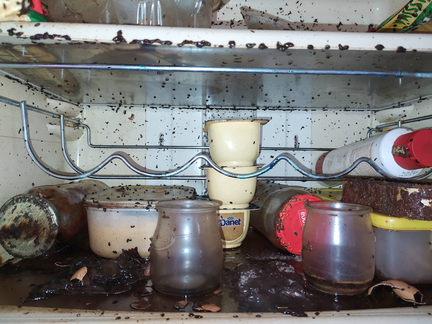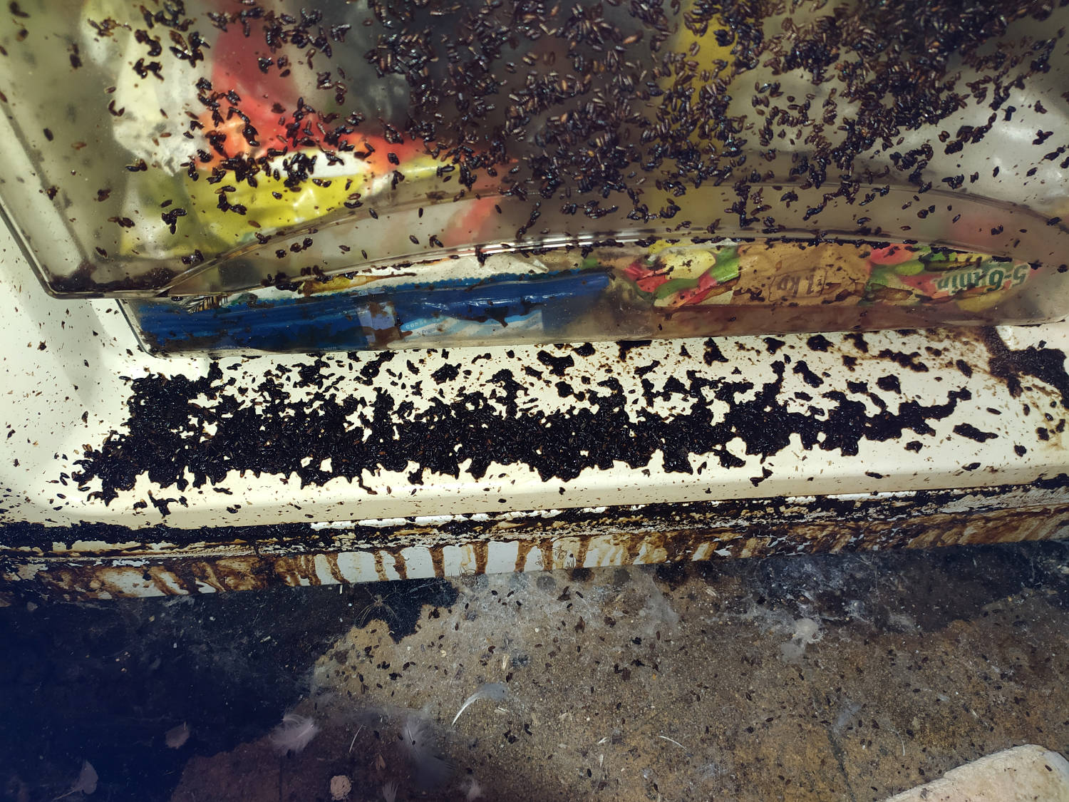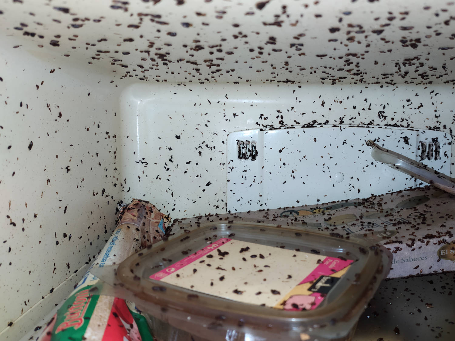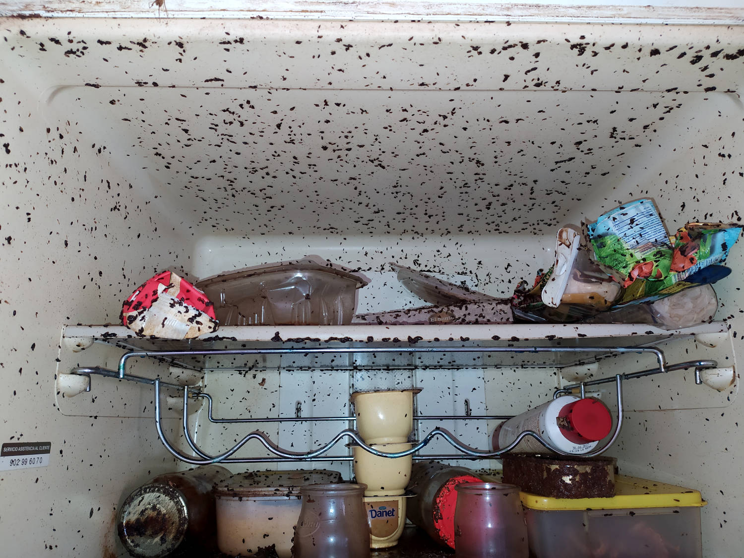 En esta entrada se pueden ver imágenes de una nevera que quedó llena de comida en un piso abandonado. Esto fue aprovechado por mosca jorobada (Megaselia) [1]. La comida en estado de descomposición creó una temperatura y humedad adecuadas para que esa mosca pudiera completar su ciclo. Al abrir la nevera, pude ver lo que se muestra en las imágenes. Miles de pupas, pero ninguna larva o adulto.