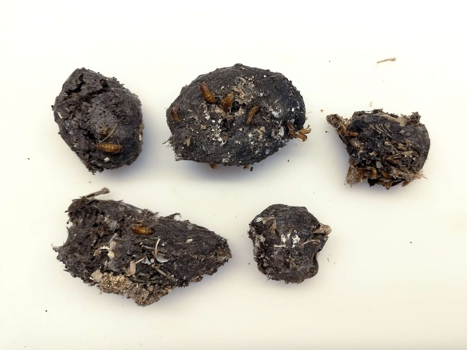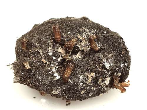 Recogí unas egagrópilas de lechuza común (Tyto alba) hace un mes. A diferencia de las que recogí a principios de año, cuando dediqué una entrada al contenido de las egagrópilas [1], estas no eran frescas. Parecían llevar muchos meses. Estaban secas y sobre la egagrópila había cutículas de crisálida de tineido (figura 1 y 2). Al deshacer una de ellas pude ver que no había pelo, pero sí una gran cantidad de excrementos (figura 3). Esto confirmó que la larva de algún microlepidóptero se estaba alimentando del pelo. Entonces pensé en guardar las egagrópilas para ver si salía algún adulto y así determinar la especie. Y justo ayer me acordé del tema y vi que había dos adultos. Para mi sorpresa vi que pertenecían a la especie Trichophaga tapetzella, conocida como polilla de los tapices (figuras 4 a 6).