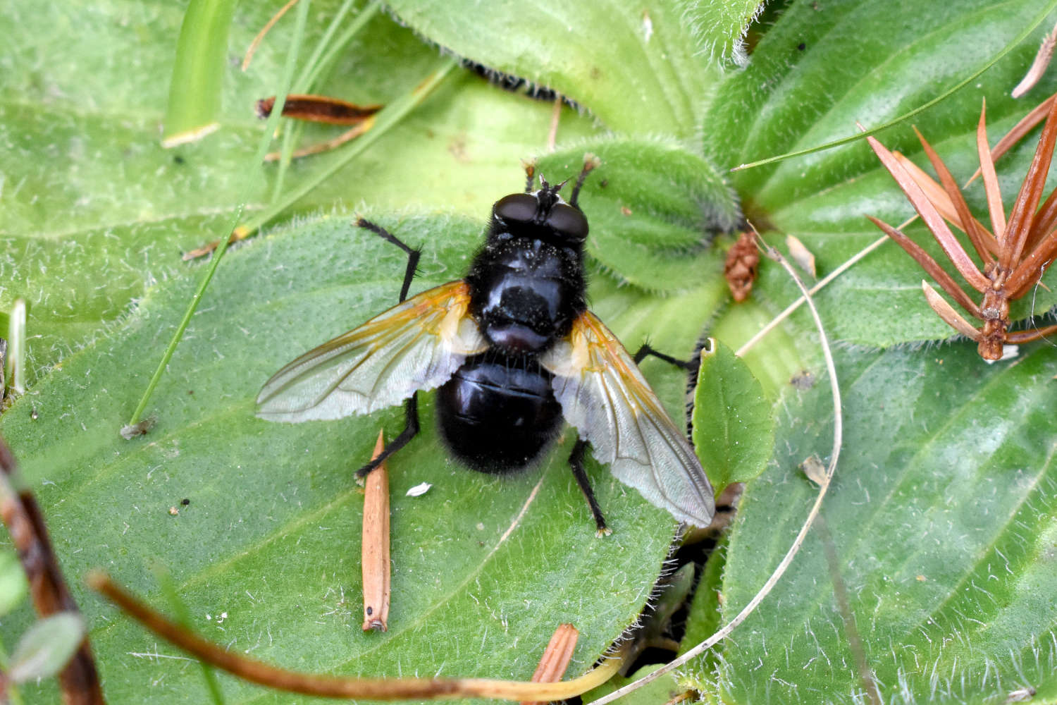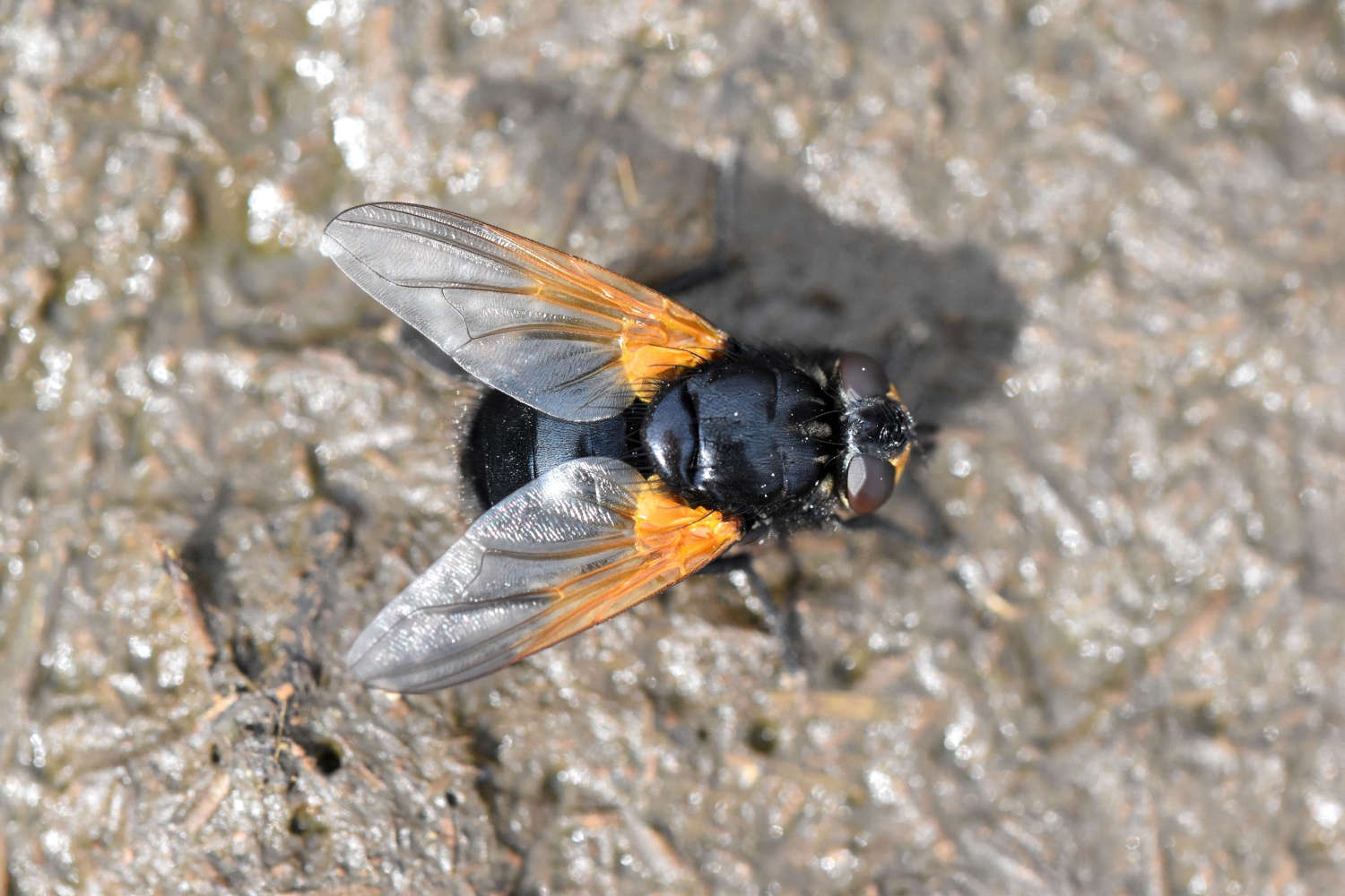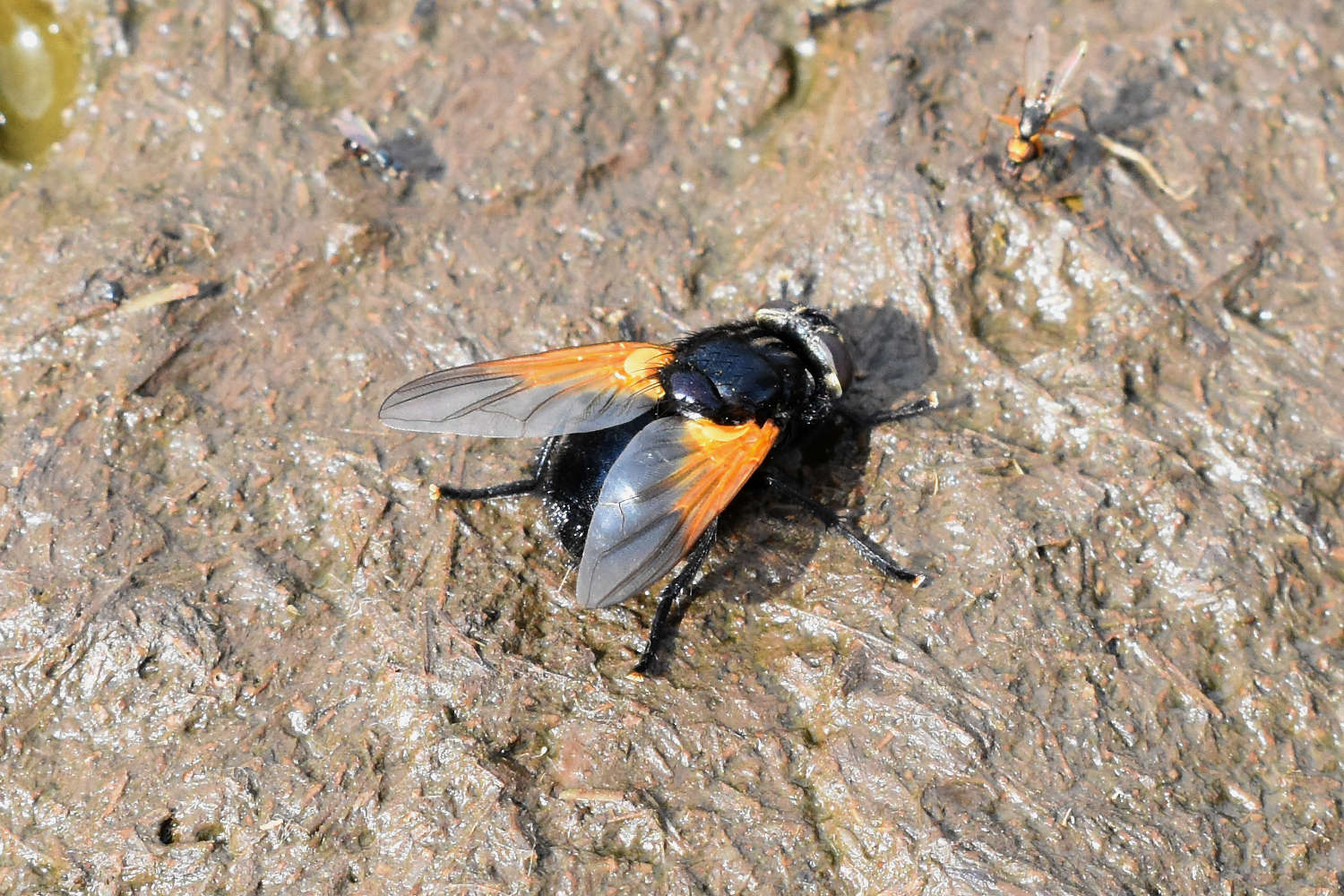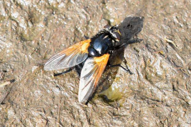 El pasado domingo estuve paseando por el Prat de l’Arp, en la vertiente norte de la Sierra del Port del Comte, a 1.900 metros de altitud. Desde la estación de esquí Tuixén-Lavansa parte un bonito camino con espectacular vista sobre los Pirineos. Al poco de empezar el camino encontré una boñiga fresca de vaca. En el centro vi una gran mosca negra cuyas alas destacan por tener la base amarilla. No pude hacer otra cosa que tomar unas fotografías. Se trataba de una Mesembrina meridiana (Muscidae) que estaba allí aprovechando todo ese montón de energía como si de un regalo del cielo se tratara.