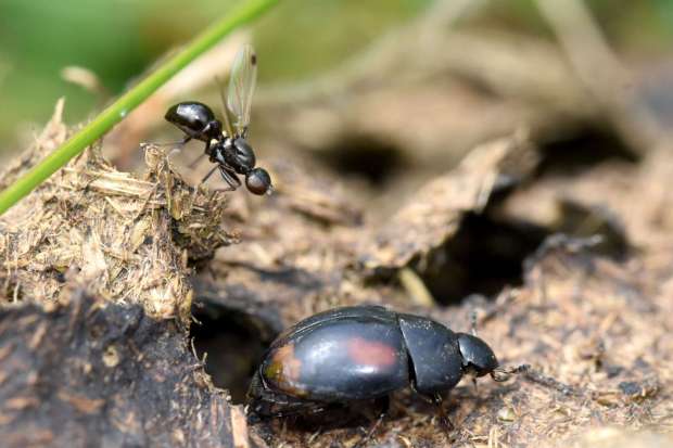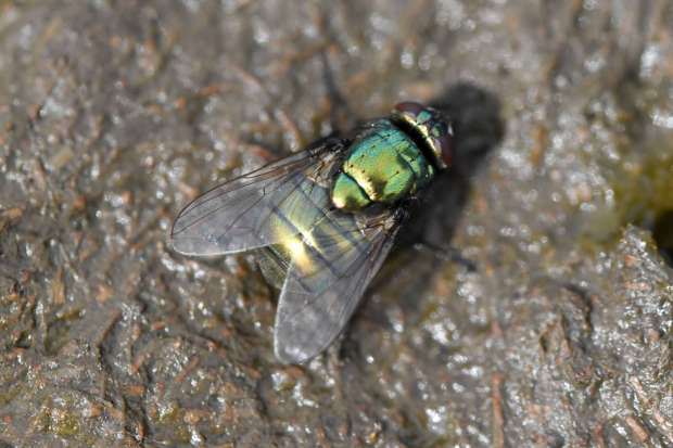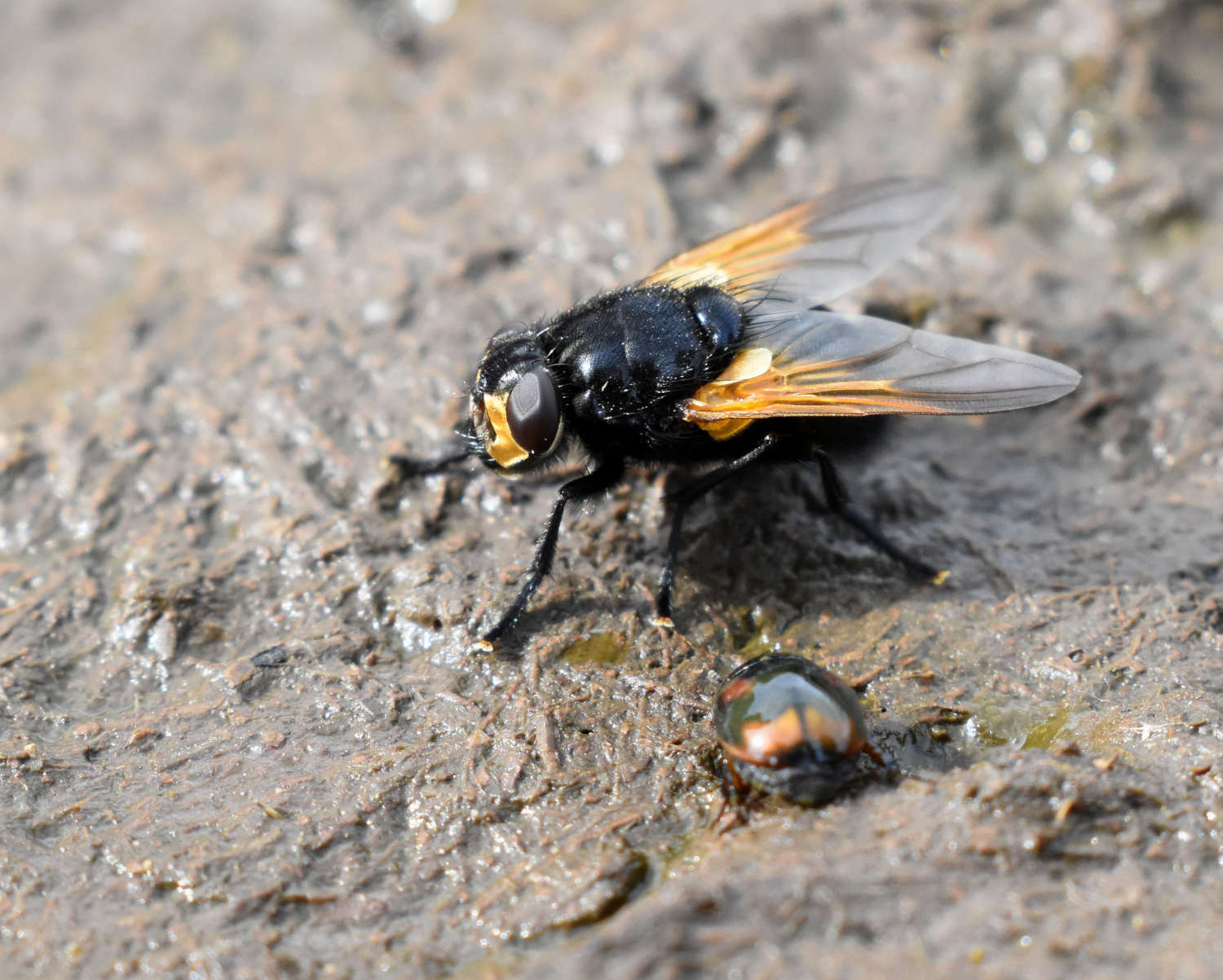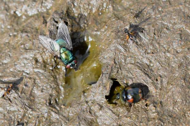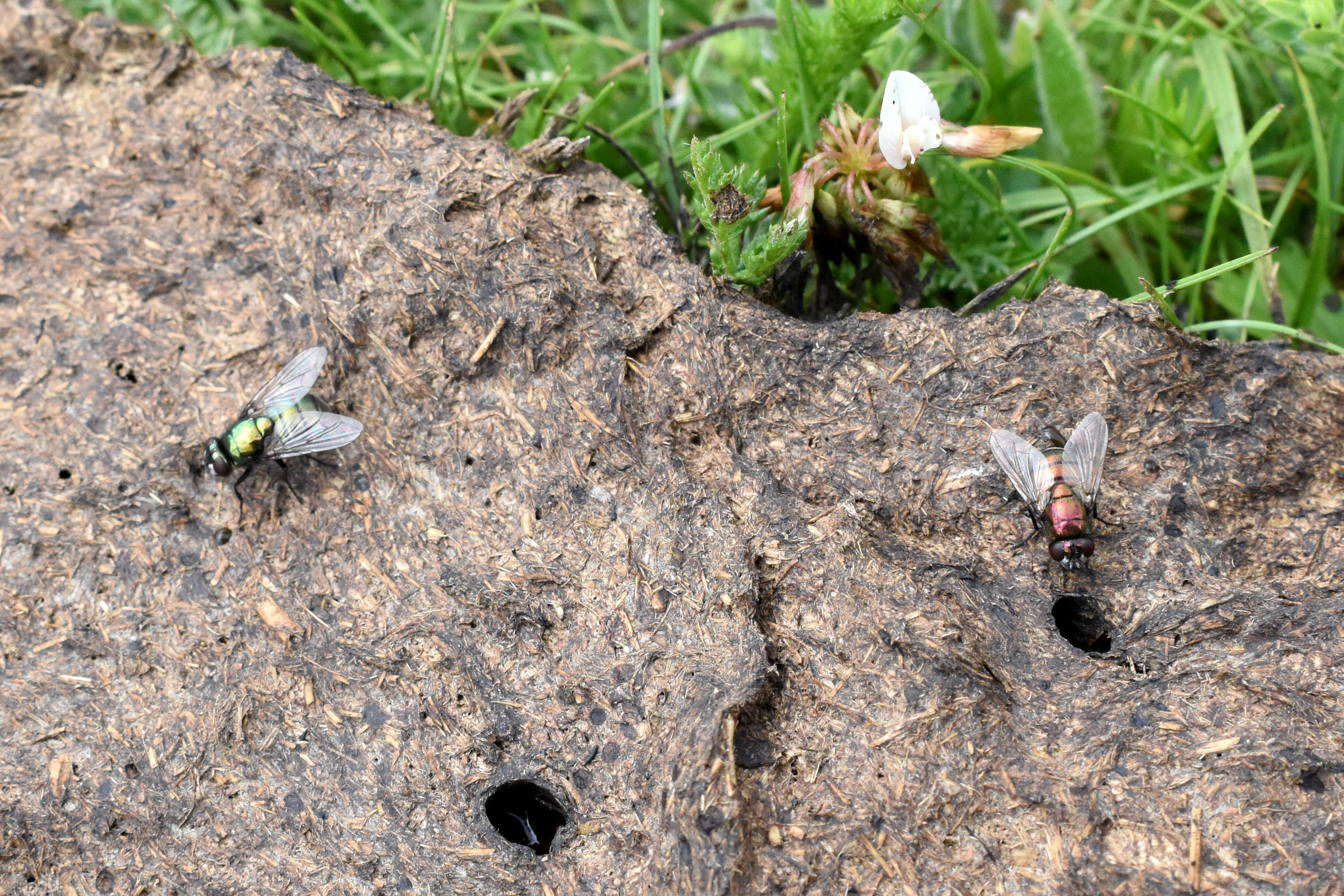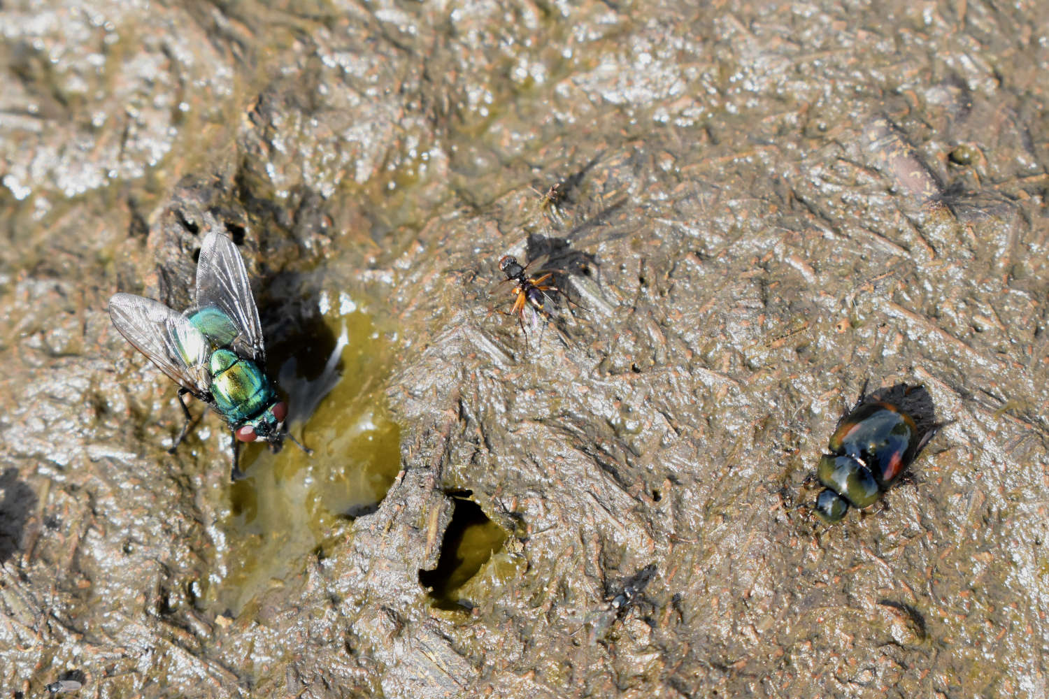 Entonces decidí ver qué especies habían llegado para aprovechar la boñiga fresca. Me arrodillé y tomé fotografías. Y también alguna muestra. Además del múscido de gran tamaño había dos especies de dípteros, Neomyia cornicina (Muscidae) y Sepsis thoracica (Sepsidae), y una especie de coleóptero, Sphaeridium scarabaeoides (Hydrophilidae). Estas son las especies que encontré en esta boñiga en un momento dado sobre las 11 de la mañana. Por supuesto, podrían haber más. Y a medida que transcurren los días, sobre la boñiga aparecen otras especies tanto aquellas que se alimentan del mismo excremento (coprófagas) como las que se alimentan de las especies que allí se desarrollan (depredadoras). Es interesante e increíble toda la vida que genera un sustrato como es la deposición de una vaca.