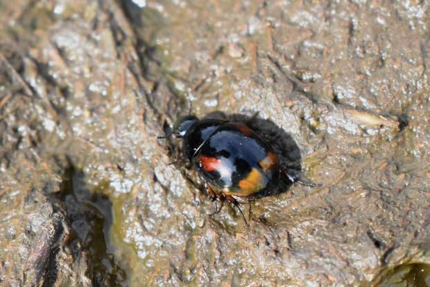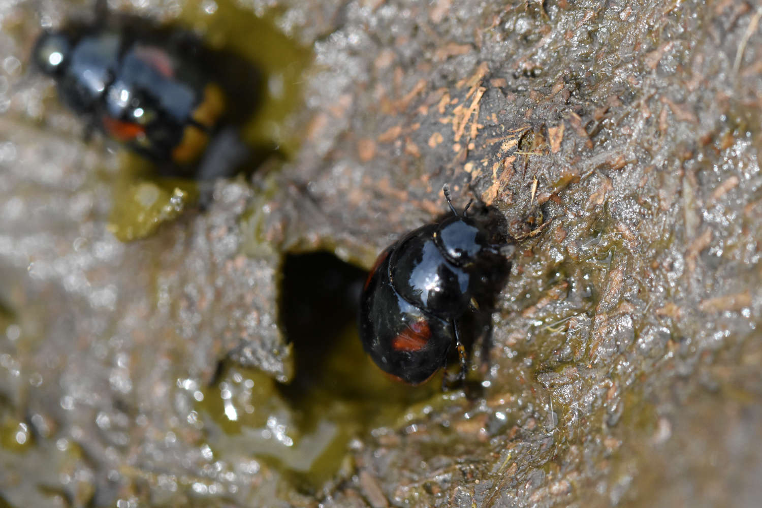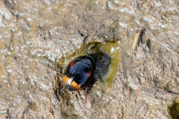 Y para acabar, mención a Sphaeridium scarabaeoides, coleóptero de gran belleza (figuras 20 a 24). La hembra deposita la puesta sobre excrementos de mamífero como vaca, caballo u oveja y, también, sobre otra materia orgánica en descomposición. Por tanto, la larva es coprófaga y saprófaga [2]. En todas las boñigas que vi en el prado abundaba esta especie. Al ser molestados, los adultos emprendían rápido el vuelo.
