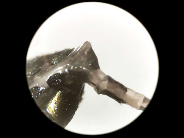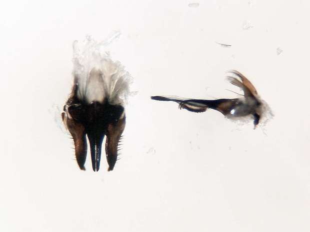 La identificación la hice siguiendo las claves de K. Szpila [3]. La forma del ala me llevó al género Lucilia (figura 3) y los dos pares de cerdas acrosticales posteriores a la sutura me indicó que podía ser L. ampullacea, L. caesar o L. illustris (figura 4). Entonces pasé a mirar la genitalia de los machos (figura 5) y de las hembras (figura 6). En el caso de la genitalia de los machos, se ve claro. Sin embargo, no es fácil en el caso de las hembras, ya que es más sutil. Aunque teniendo en cuenta la identificación de los machos, facilita la identificación.