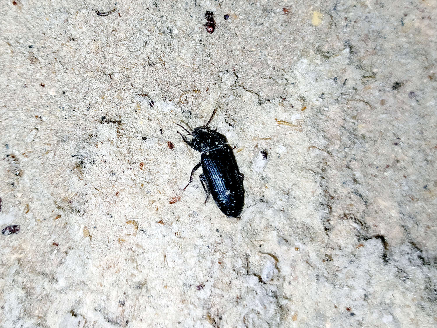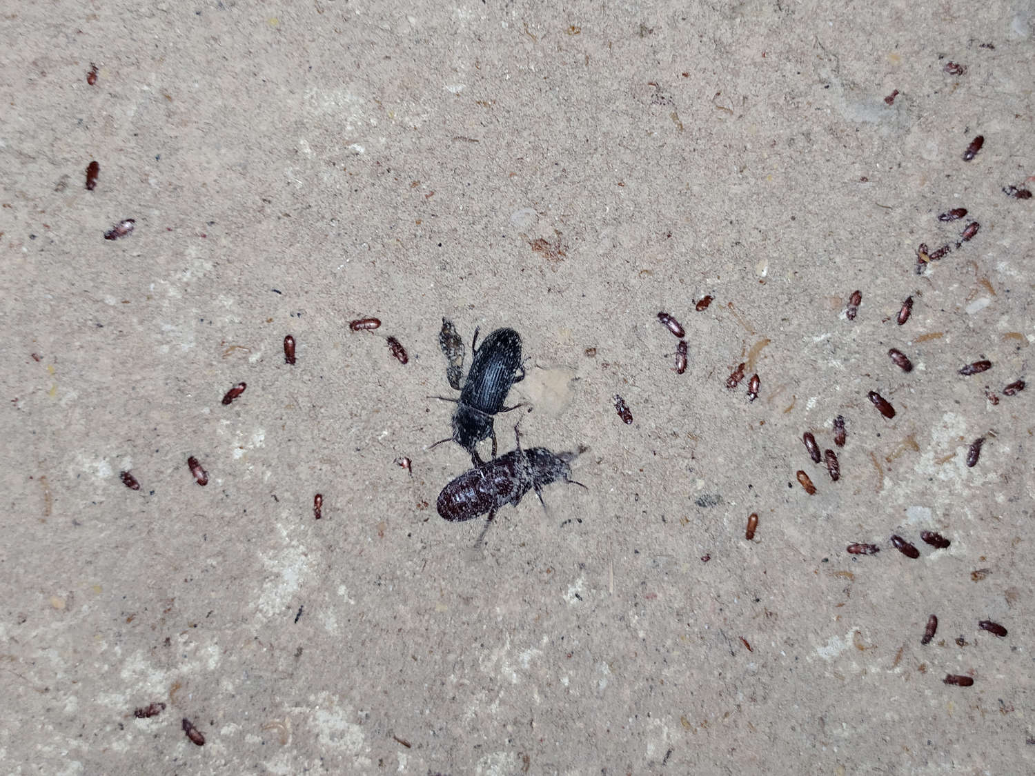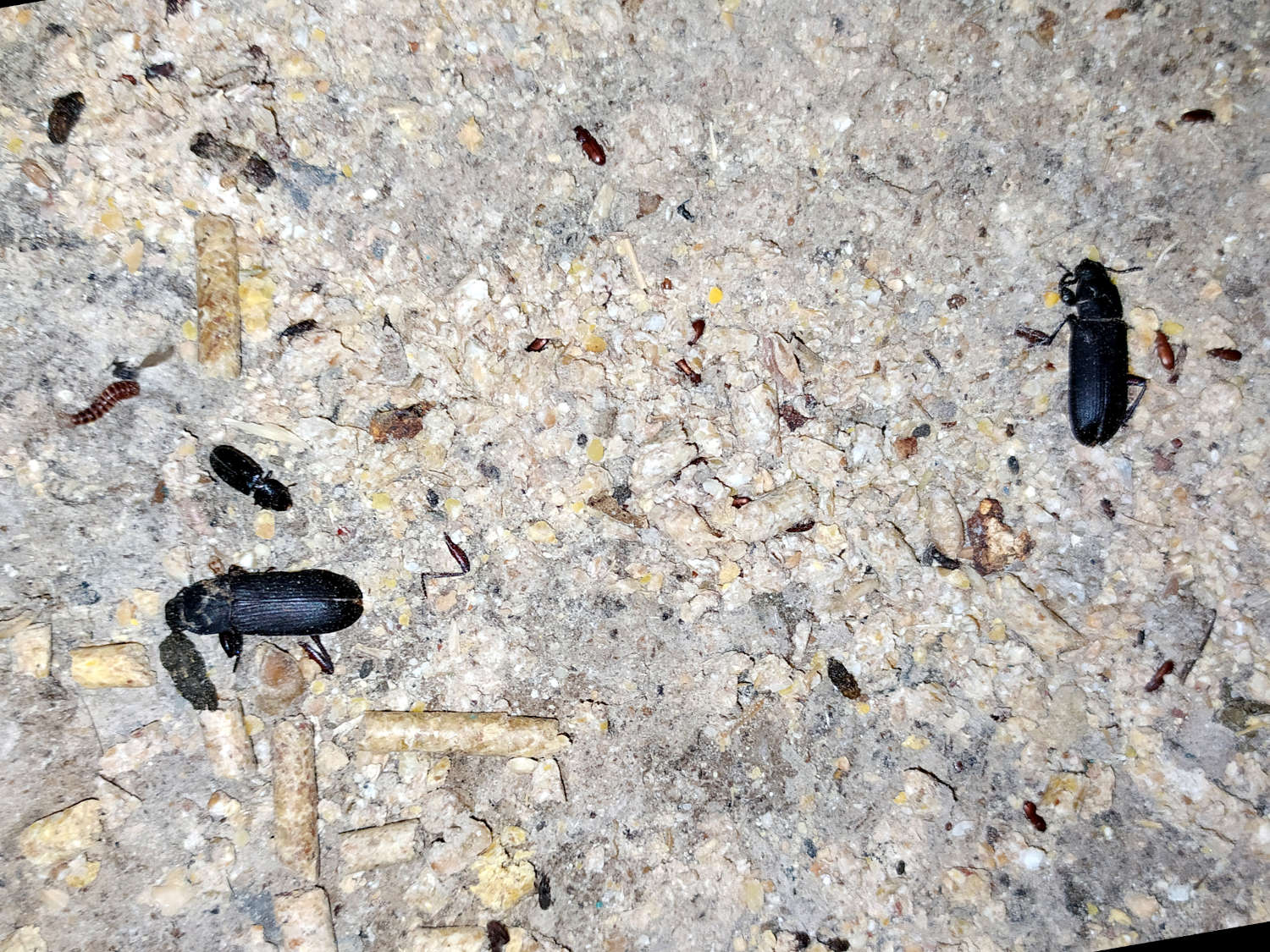 Encontré en una fábrica de piensos larvas y adultos de Tenebrio molitor, especie conocida como gusano de la harina. Con la llegada del calor es fácil encontrar adultos en esta clase de instalaciones cuando las larvas pasan al estadio de adulto. En zonas donde se acumula la harina buscan cobijo en rendijas y debajo de objetos. Sin embargo, esto contrasta con Tenebrio obscurus, el gusano oscuro de la harina, que aunque se pueda encontrar en fábricas, abundan más en cobertizos y gallineros de granjas. Encuentro esta especie en zonas donde se acumulan restos de pienso, grano, paja, etc. [1]. También la he encontrado en almacenes de granjas porcinas. Parece mejor adaptada al clima exterior de la zona donde vivo.