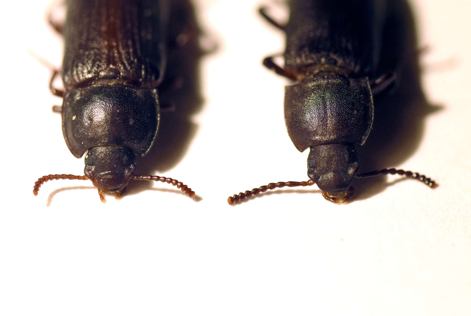 En las imágenes muestro juntos un individuo adulto de cada especie para que se puedan apreciar las diferencias. La más evidente no es el color, sino el tono de pronoto y élitros. En T. molitor el tono es brillante y, en T. obscurus, es mate (figura 1). Por supuesto que en esta especie el color es más oscuro como su nombre indica. También se observa oscurecimiento en las larvas. Aunque he encontrado T. molitor que son oscuros. En cuanto a la forma, destacan las diferencias del pronoto. En T. obscurus es más cuadrado y las esquinas son más agudas. En T. molitor es más ancho que largo y redondeado (figuras 1-4).