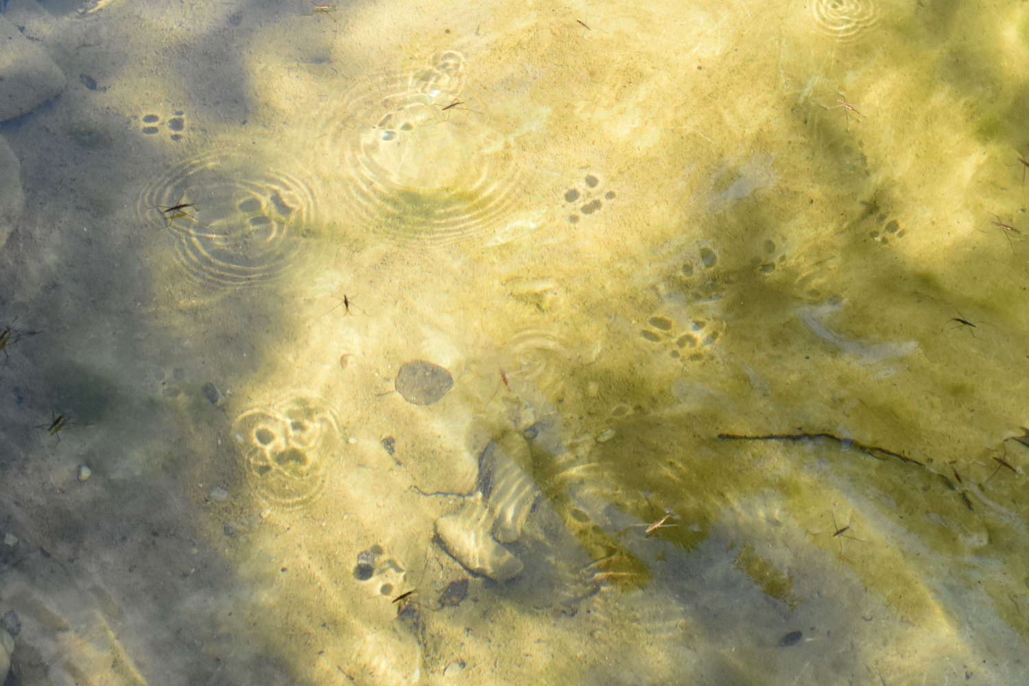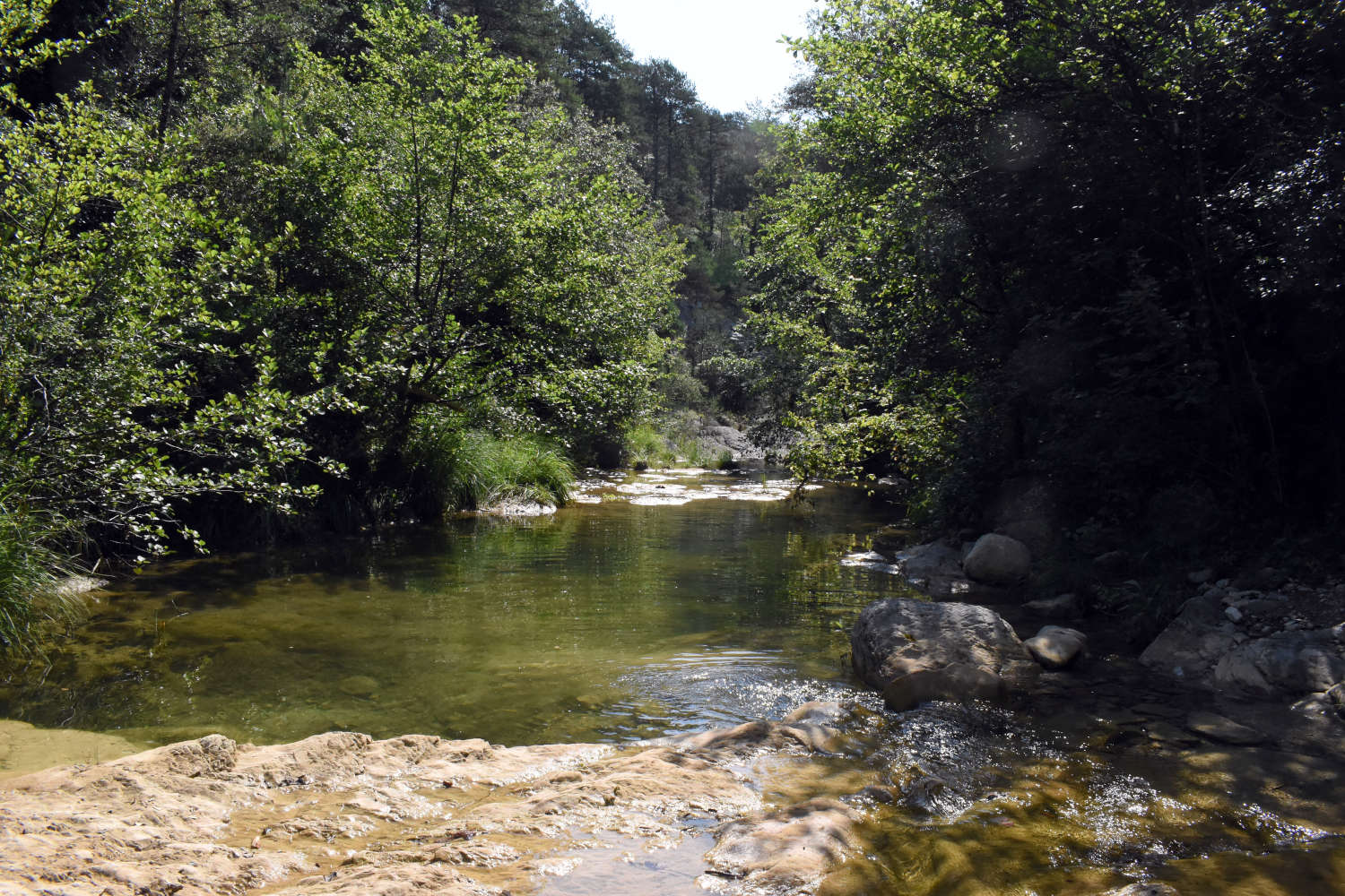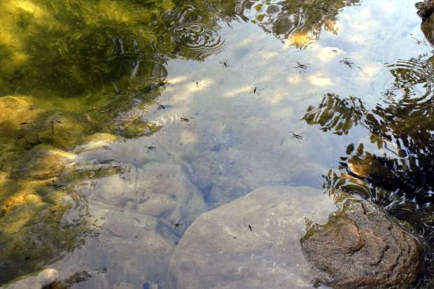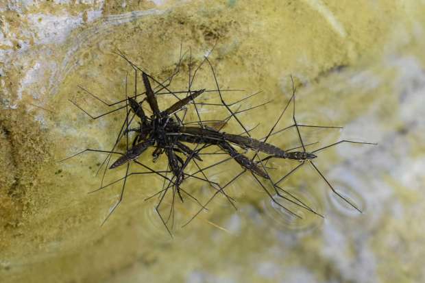 Hace unos días pude disfrutar de un entorno de gran belleza como es la riera de Castellar. Se trata de un curso fluvial que nace en la Vall de Bac y desagua en el Fluvià, en Castellfollit de la Roca, Garrotxa. Bañarse en un río tiene algo de mágico. Uno está rodeado de árboles y naturaleza. Hay mucho que observar. El agua bajaba lenta y sobre la superficie se podían ver zapateros de río o guérridos (Gerridae). Estos heterópteros nos reciben primero con miedo, pero luego con curiosiad si nos quedamos quietos. Son insectos fáciles de observar y que nos dejan admirados por su capacidad para patinar.