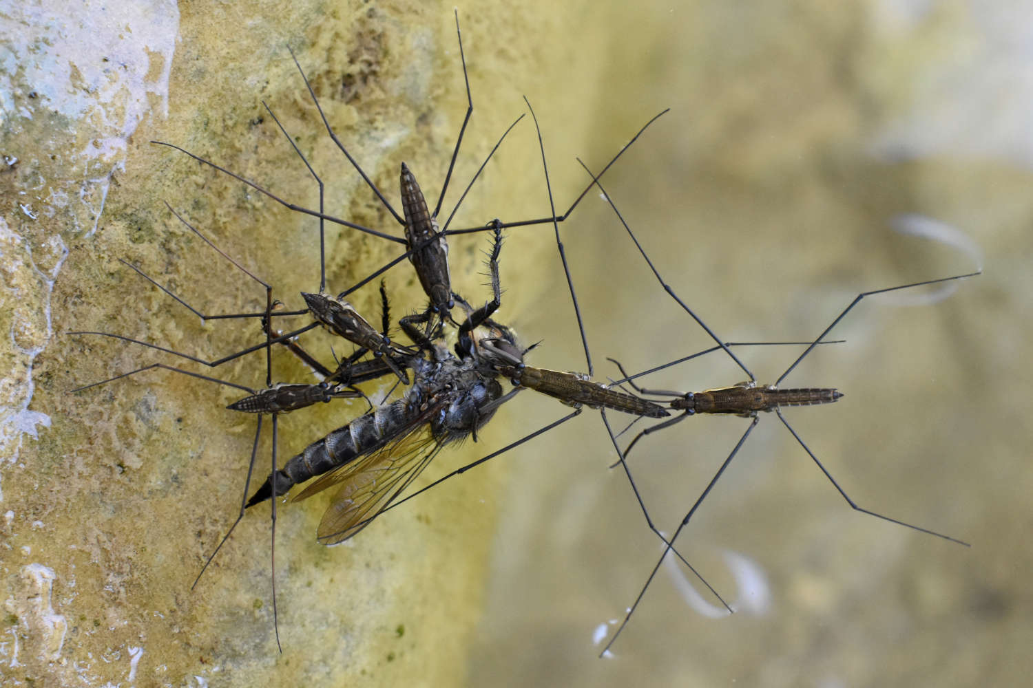 Me senté sobre una piedra a la sombra para observarlos. Tenía mis pies en el agua. Vi como se me acercaban algunos para averiguar qué tipo de animal era y, probablemente, si era comestible. Entonces vi que uno que se dirigía a la orilla con una presa muy grande. Estaba vivo, pero atrapado por el agua. Vi que era un Asilinae, una mosca cazadora. Puede que pertenezca al género Tolmerus (figuras 8 a 13). Detrás del guérrido iban otros detrás atraídos con la idea de un festín. Luego fueron llegando otros. Estuve tomando fotografías un rato. Cuando decidí marchar, sobre el cadáver había una melé de 20 (figuras 14 a 18). Para estos insectos el agua es como una gran telaraña. Van de un lado para otro. Cuando cae algo sobre el agua, se acercan. Si es un insecto, se alimentarán de él.