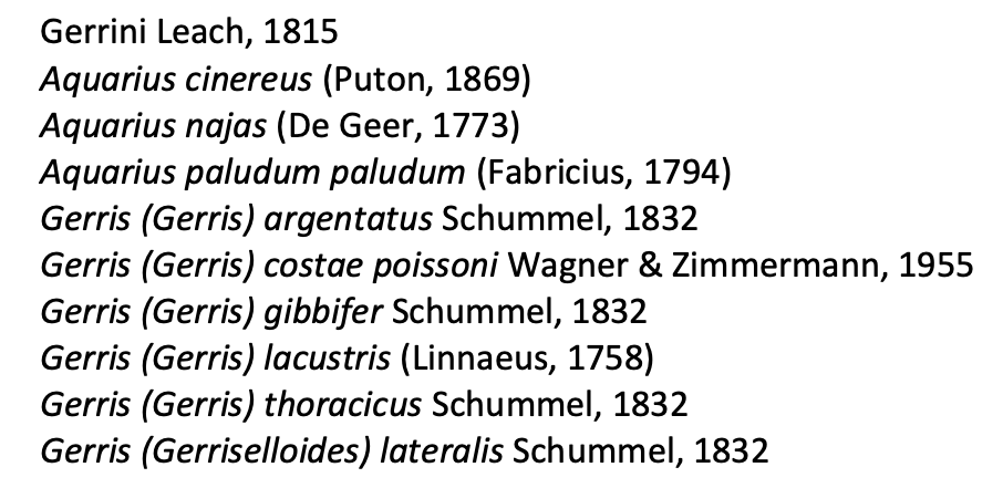 Observé que los adultos eran ápteros y parecían pertenecer todos a una misma especie. En casa, gracias a las fotografías, determiné que se trataba de Aquarius najas, una especie común en cursos altos de ríos. Años atrás, dediqué una entrada a A. paludum que fotografié en el río Ebro [1]. Según el catálogo de heterópteros de Cataluña de M. Goula et al. [2], que ha sido actualizado este julio de 2020, tenemos 9 especies de guérridos repartidas en dos géneros, Aquarius y Gerris (figura 2). Para diferenciar ambos géneros, hay que tener en consideración la longitud de los artejos de las antenas. En Aquarius, el primer artejo es más largo que la suma del segundo y el tercero. En cambio, en Gerris el primer artejo es tan largo o un poco más corto que la suma del segundo y el tercero [3]. Luego hay que observar la ausencia de alas y las puntas espinosas laterales del séptimo segmento abdominal. En el caso de A. paludum estas llegan hasta el extremo del abdomen. Por otra parte, A. najas y A. cinereus son bastante parecidas con la mayoría de individuos ápteros. Pero teniendo en cuenta la coloración oscura y el curso de cabecera en el que los encontré, en este caso se trataría de A. najas.