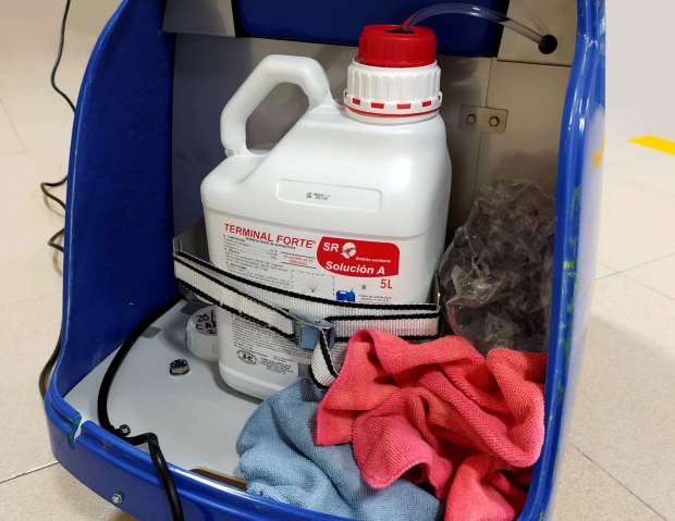 El producto utilizado ha sido Terminal Forte SR de José Collado SA. Un desifectante con dos materias activas: peróxido de hidrógeno (9%) y ácido peracético (0’25%). El producto viene servido en dos envases, Solución A y Solución B, que deben mezclarse antes. Esta composición da un amplio espectro de acción contra microorganismos. Es bactericida, fungicida, viricida y esporicida. Tiene registro de la AEMPS con número 619-DES para su uso sobre superficies de ámbito sanitario. Y también está registrado para uso ambiental en el registro de plaguicidas no agrícolas con el número 10-20/40/90-05739. En resumen, un aparato y un desinfectante de primera.