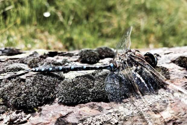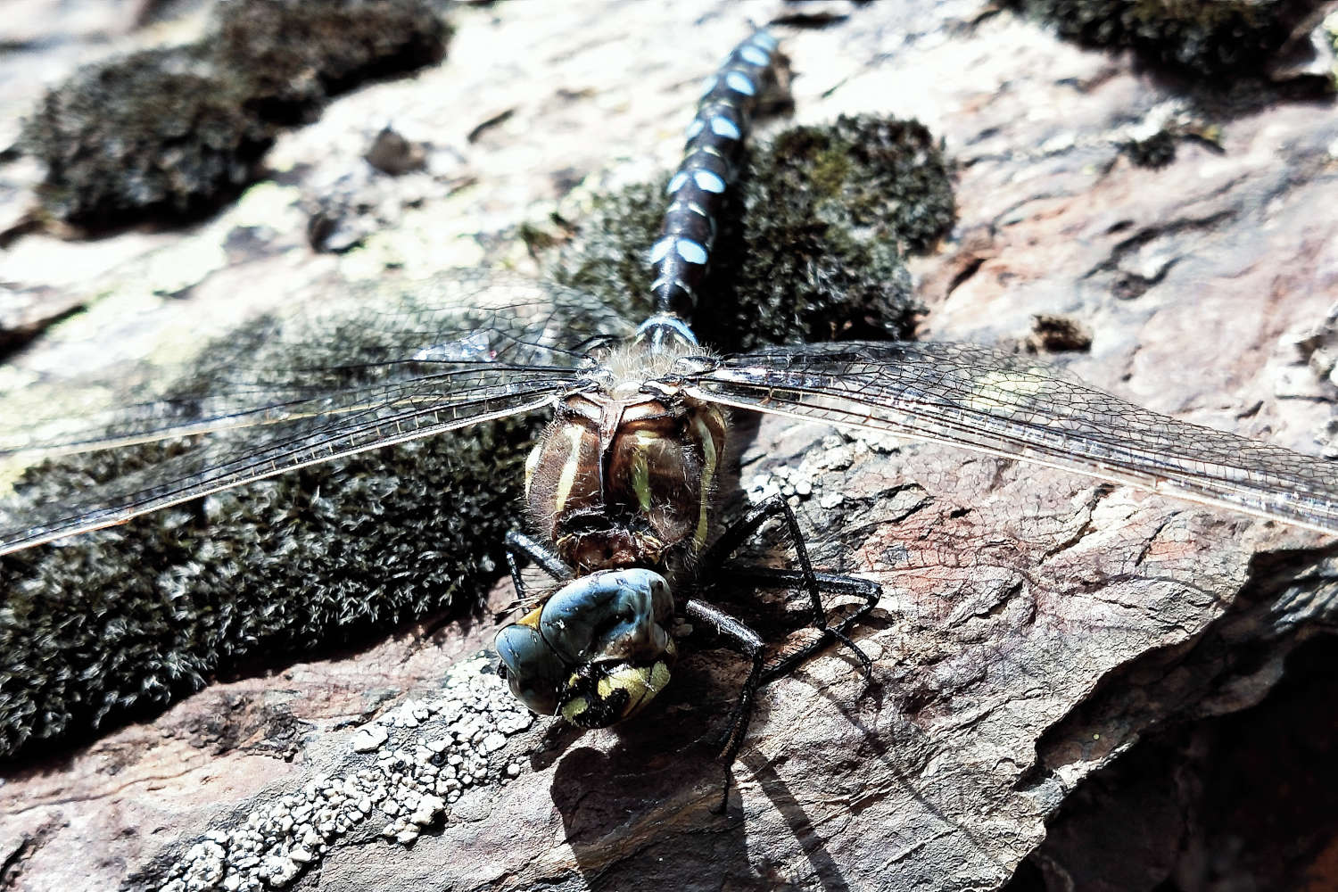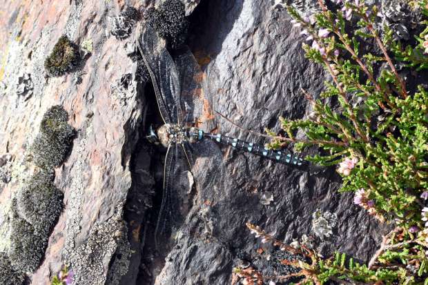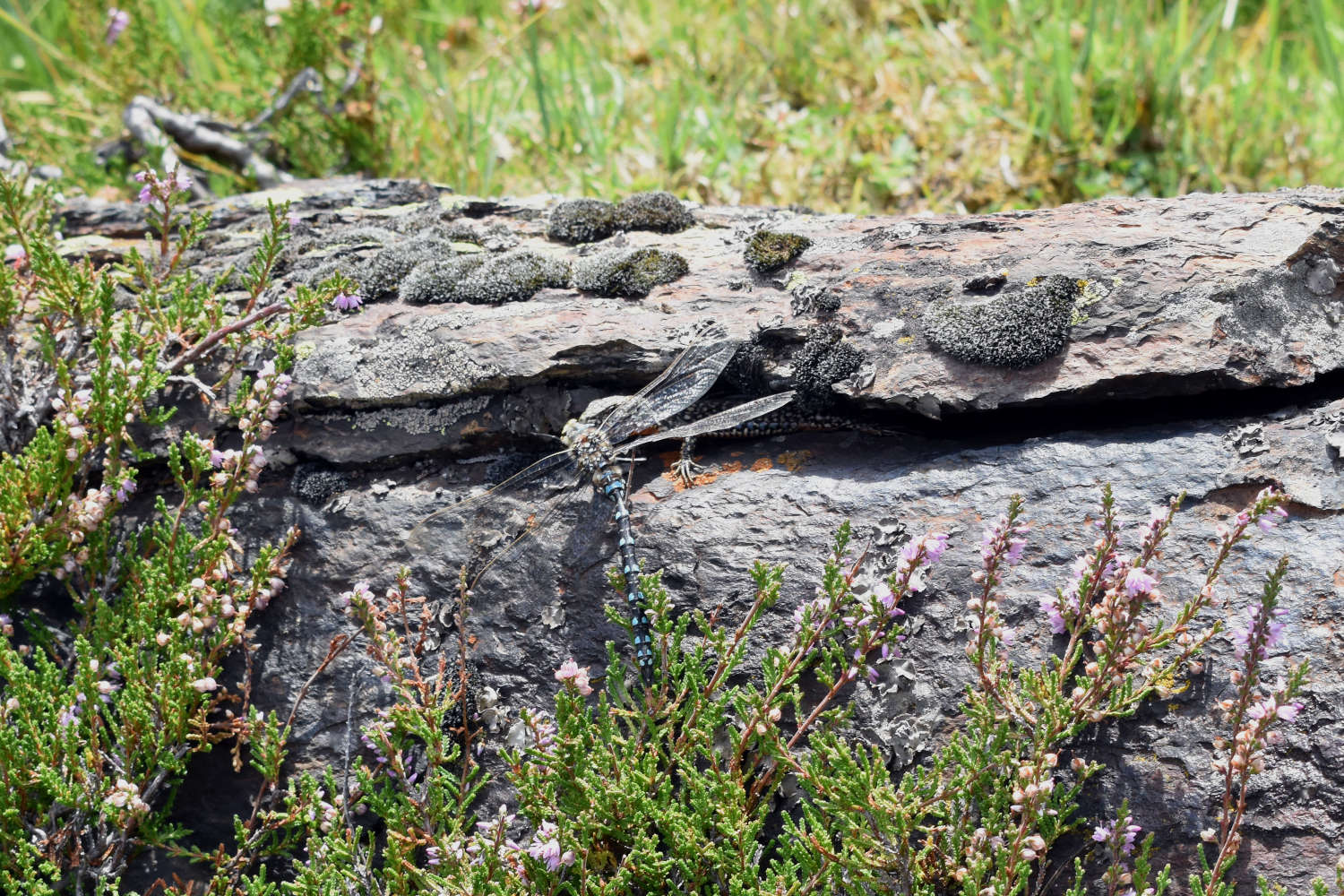Mientras estaba tomando fotografías, mi mujer dirigió mi atención hacia un macho que tenía en la boca una libélula (figuras 13-14). Me acerqué para tomar unas imágenes de la situación. Y luego, cuando el macho se escondió ante mi presencia, pude fotografiar el odonato (figuras 15-17). Pensé que podría ser una especie poco común al estar a tanta altitud. Consulté con Adrià Miralles quien me dijo que era un macho de Aeshna juncea (Anisoptera, Aeshnidae), una especie escasa. Según el catálogo de libélulas de Cataluña [3], en la Península Ibérica se encuentra de manera discontinua en la parte más al norte y, por lo general, a partir de los 1.600 metros. A esto hay que añadir que cría en pequeñas colecciones de agua en las que haya abundante vegetación. De hecho, encontré varios lugares en los que podría criar. En el Plan d’Están, por ejemplo, hay una amplia zona pantanosa cubierta de vegetación.
