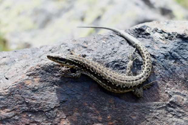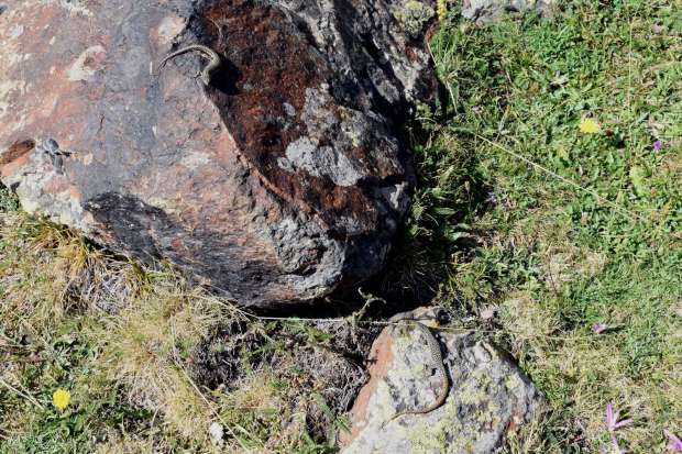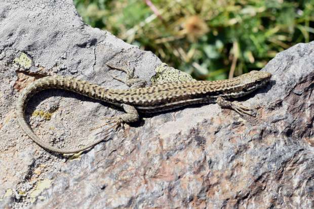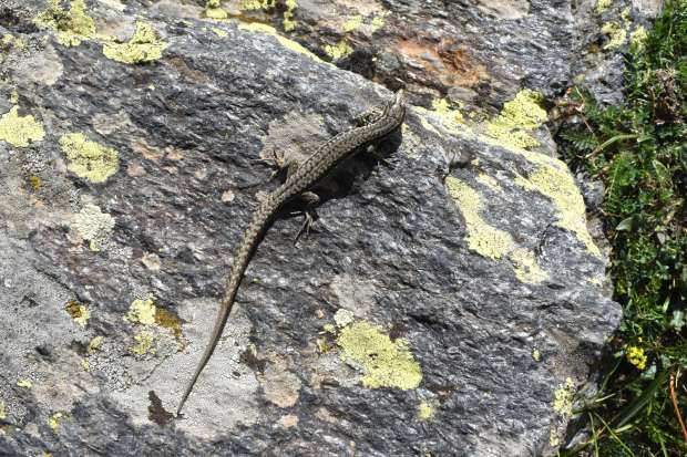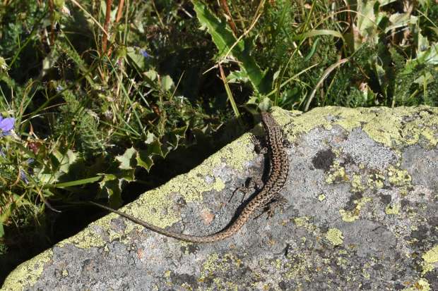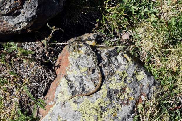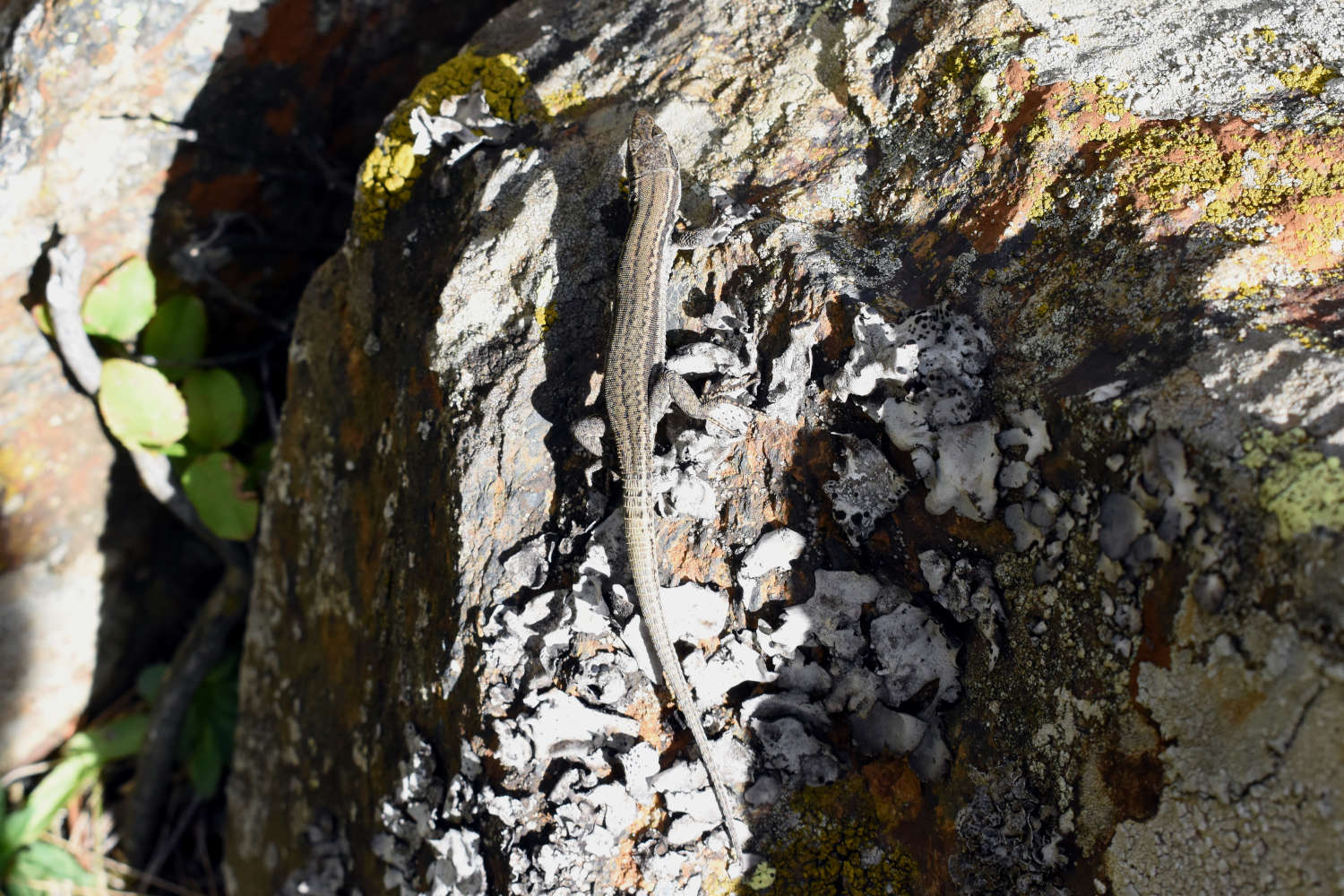 Tomé un buen número de fotografías de las lagartijas. Los adultos al sol parecían confiados y dejaron que me acercara. Todas las que se encontraban cerca de las ruinas del antiguo hospital pertenecían al género Podarcis. Y al tratarse de un lugar de alta montaña en la parte septentrional de la Península Ibérica, todo apuntaba a que pertenecían a la especie Podarcis muralis, vulgarmente lagartija roquera. No es fácil la determinación de las especies de este género, pero tenemos a disposición magníficos textos como el de Albert Masó y Manuel Pijoan de 2011 que constituye un buen pilar [1]. Años atrás dediqué una entrada a Podarcis liolepis, lagartija parda, que es la especie común en la zona de Barcelona y cercanías y con la que se podría confundir [2].