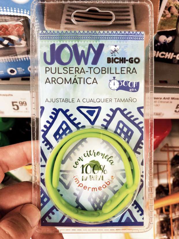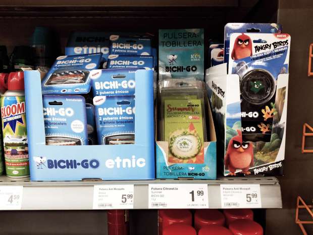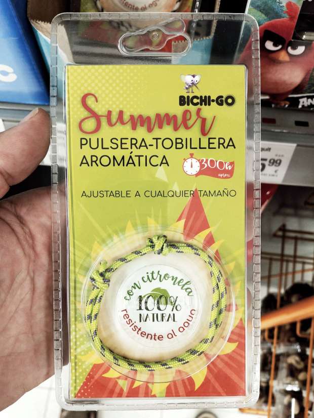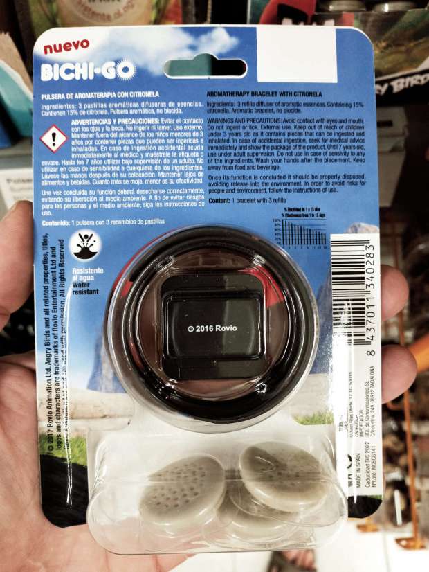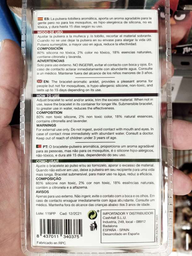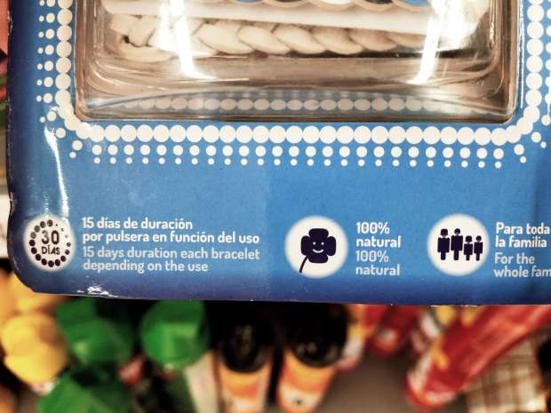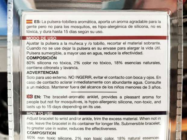 Sin embargo, el colmo está en la pulsera slap porque cada carga dura 15 días, lo cual es un enorme ahorro para las familias, ya que con una sola pulsera tienes a los niños protegidos casi todas las vacaciones. En el anverso de la etiqueta se lee: «aromateriapia sin DEET. 100% natural». Como bien sabemos, el DEET es un repelente no indicado para su uso en niños y para adultos se aconseja un uso diario. Es una de los mejores repelentes que hay desarrollado en la década de 1940 para proteger a los soldados de la malaria. Por supuesto, si yo tuviera que ira a un lugar con mosquitos transmisores de enfermedades, no me pondría en absoluto ninguna pulsera ni loción a base de citronela. Pero en España somos un territorio libre de malaria, así que la empresa comercializadora juega con que sus pulseras no van a causar mucho daño por su ineficacia.