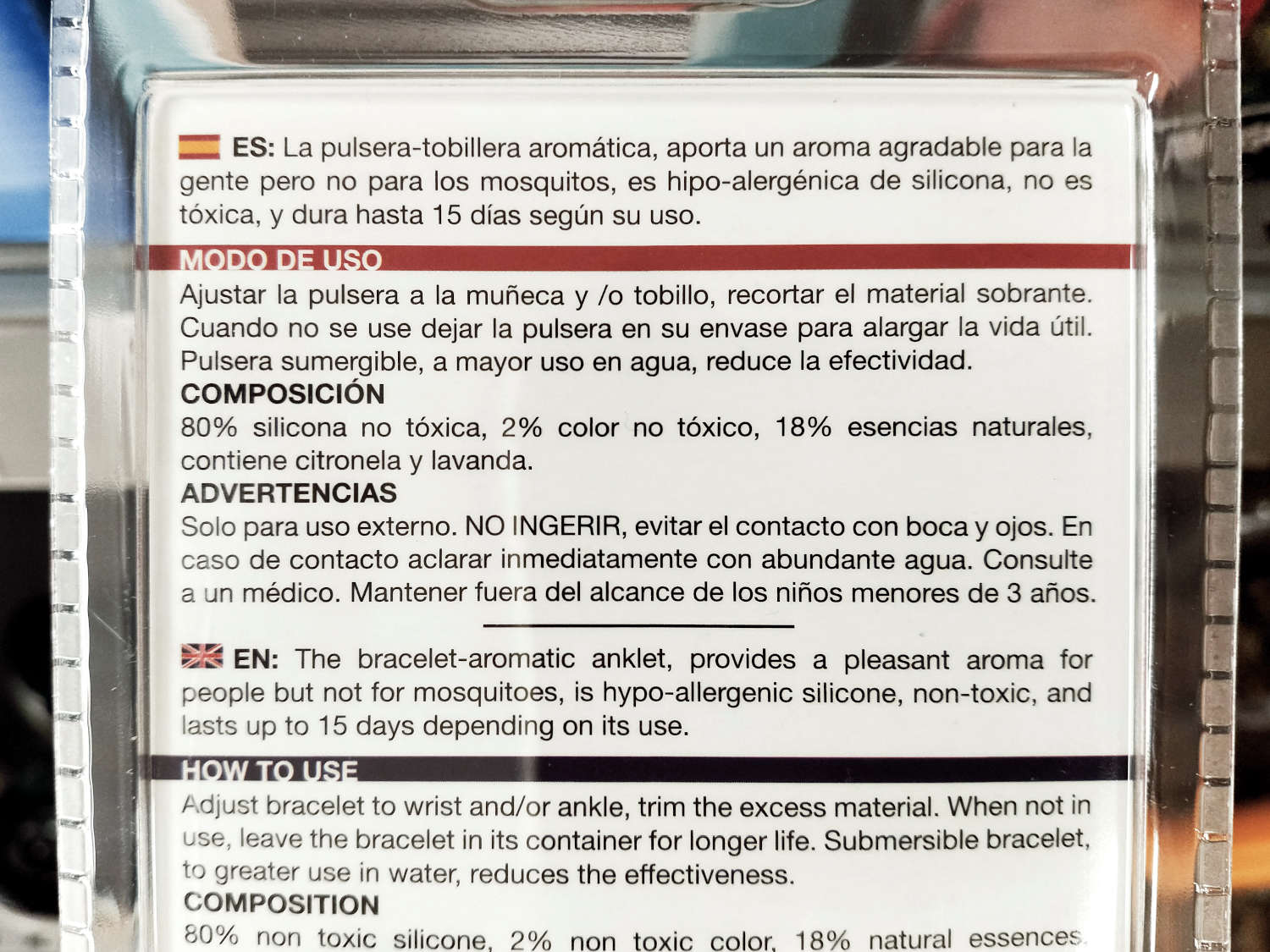 En el modelo étnico y slap, se lee esto: «pulsera de aromaterapia con citronela». Y en el modelo de tobillo dice: «Pulsera-tobillera aromática». De hecho, en este último modelo sí aparece la palabra mosquito en una sola ocasión en una frase situada en la parte posterior de la etiqueta: «la pulsera-tobillera aromática, aporta un aroma agradable para la gente per no para los mosquitos, es hipo-alergénica de silicona, no es tóxica, y dura hasta 15 días según su uso» (figuras 9). Nada más. En consecuencia, si alguien compra una de estas pulseras y no le proporciona los efectos deseados contra mosquitos, encuentro que será muy difícil que pueda llevar a cabo una reclamación. El comercializador puede aducir que no engaña, ya que se trata de una pulsera de aromaterapia. Y aquí apunto que desconozco cuál es el significado del término aromaterapia aplicado a la pulsera.