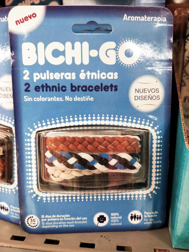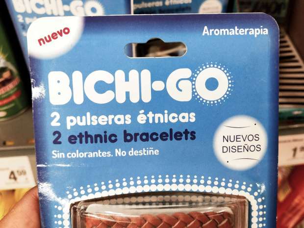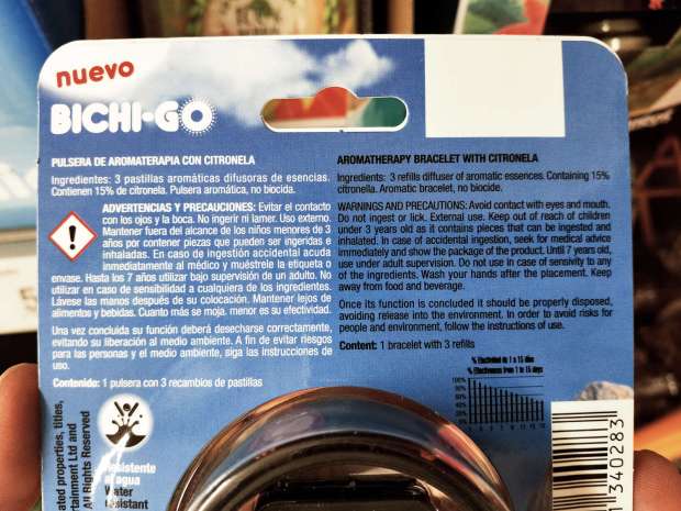 Cuando me acerqué a la estantería donde estaban las pulseras, constaté dos hechos. Uno es que las pulseras estaban junto a productos contra mosquitos. Y otro es que en la etiqueta del precio que constaba en la balda se leía que eran pulseras antimosquitos (figura 1). Si alguien tuviera dudas de la funcionalidad repelente de dichas pulseras, no caben dudas ante el conseguido nombre de Bichi-Go, gran ejercicio de inteligencia comercial. Sin embargo, si se lee con detenimiento la etiqueta de las pulseras Bichi-Go, no queda claro su uso contra mosquitos. Veamos.