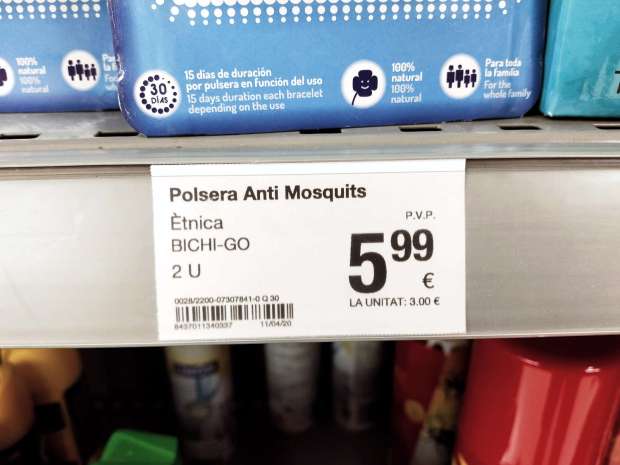 ¿Y saben qué pasa? Pues que ninguna pulsera habida o por haber en el mercado puede pasar una prueba de eficacia, sencillamente porque no funcionan. Así de simple. Por tanto, mis felicitaciones a los comercializadores de pulseras por meter un golazo al conjunto del público consumidor. Y también mis felicitaciones a los supermercados que las tienen a la venta. En este caso, las imágenes fueron tomadas en un establecimiento de Consum Cooperativa.