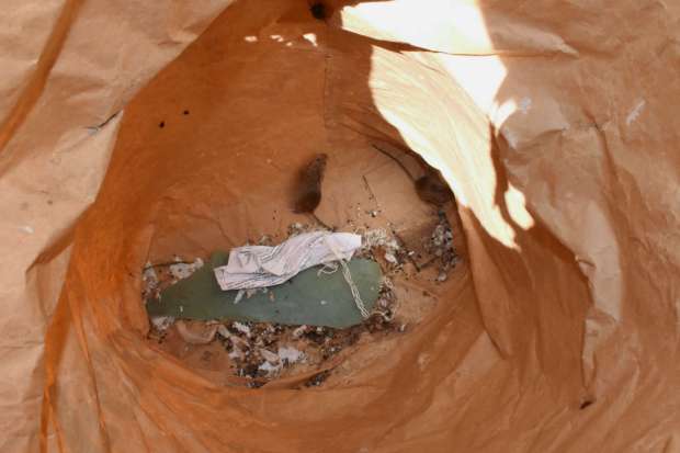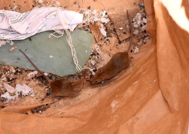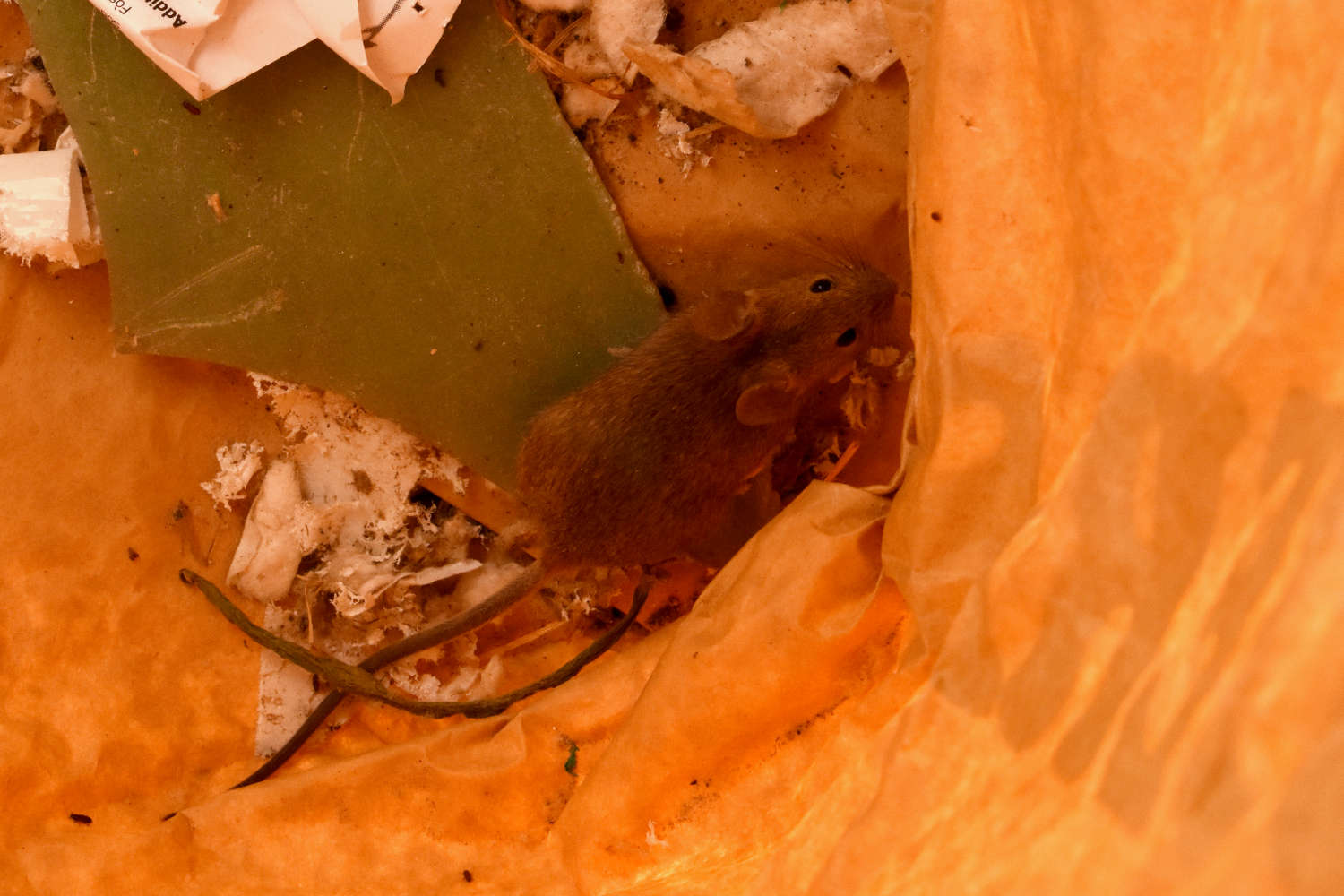 Fig 6. Ratón doméstico (Mus musculus) en un saco de papel./ C. Pradera 05-2020