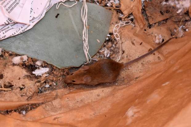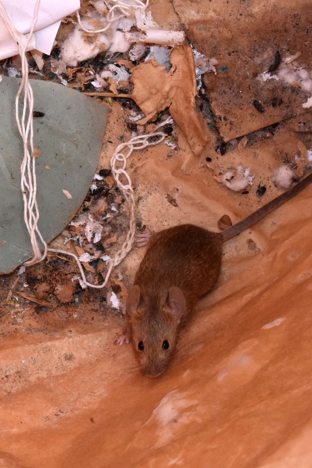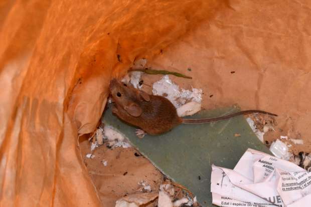 Fig 7. Ratón doméstico (Mus musculus) en un saco de papel./ C. Pradera 05-2020