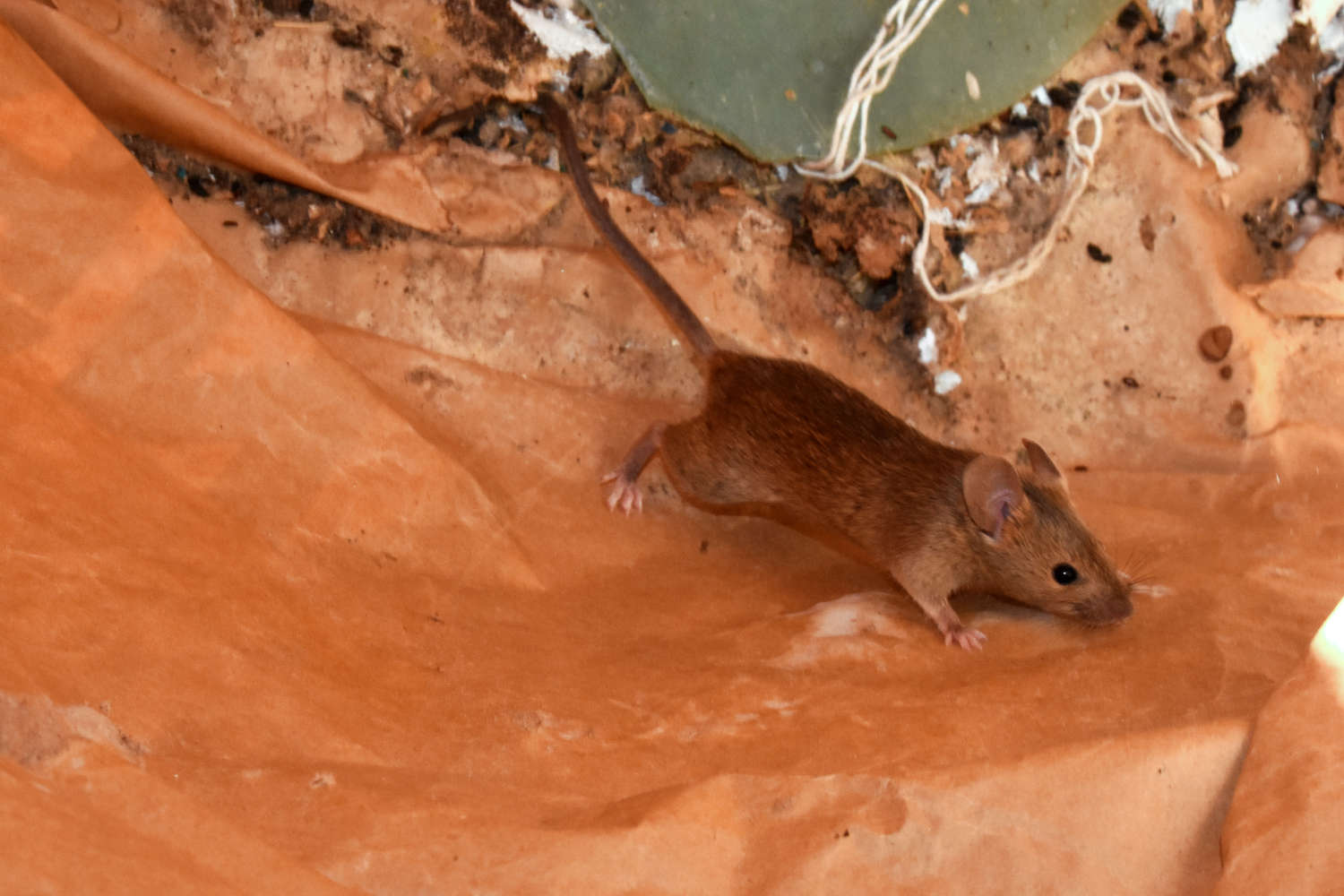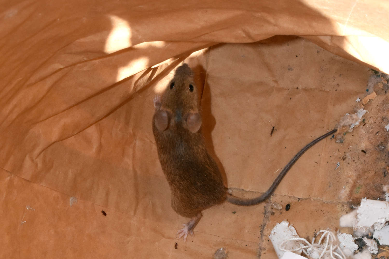 Fig 1. Ratón doméstico (Mus musculus) en un saco de papel./ C. Pradera 05-2020