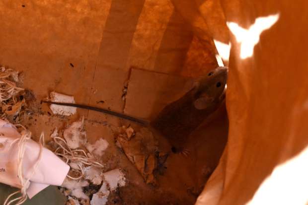 Fig 3. Ratón doméstico (Mus musculus) en un saco de papel./ C. Pradera 05-2020