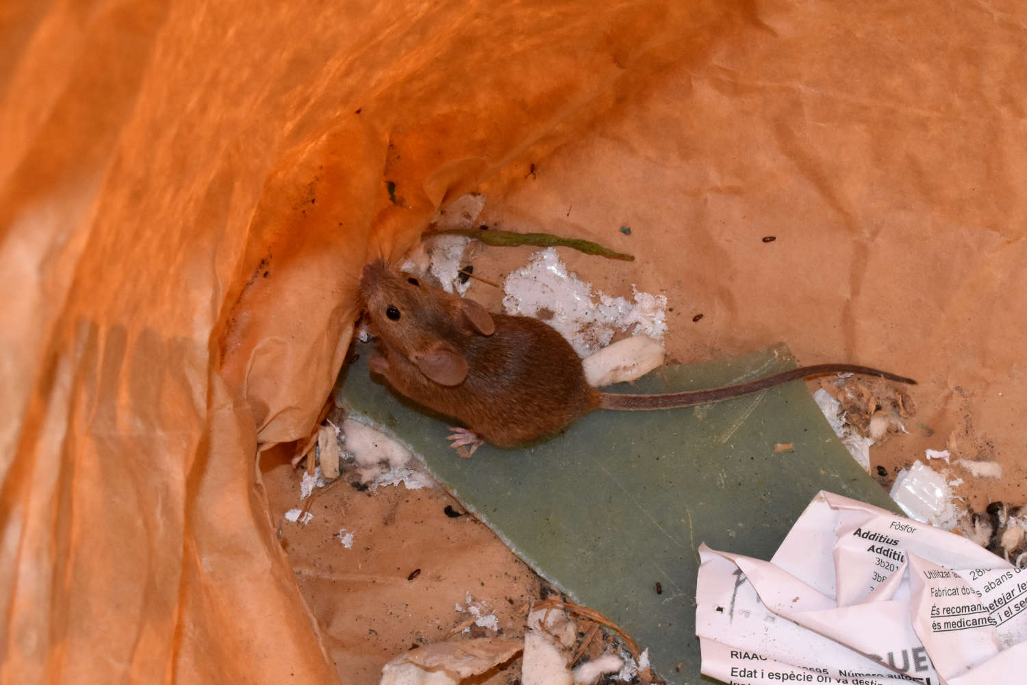 Fig 8. Ratón doméstico (Mus musculus) en un saco de papel./ C. Pradera 05-2020