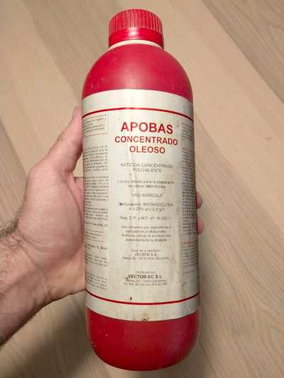 He encontrado un envase de Apobas Concentrado Oleoso de la compañía VECTEM SA de Rubí (figura 1) [1]. Estaba en un viejo almacén de una granja de cerdos. Le comenté al cliente que este producto no se podía utilizar en la actualidad ya que no estaba registrado. Y le expliqué que se debía proceder a su destrucción. Así que lo retiramos para su gestión. Aproveché para tomar unas fotografías antes y guardar la etiqueta.
