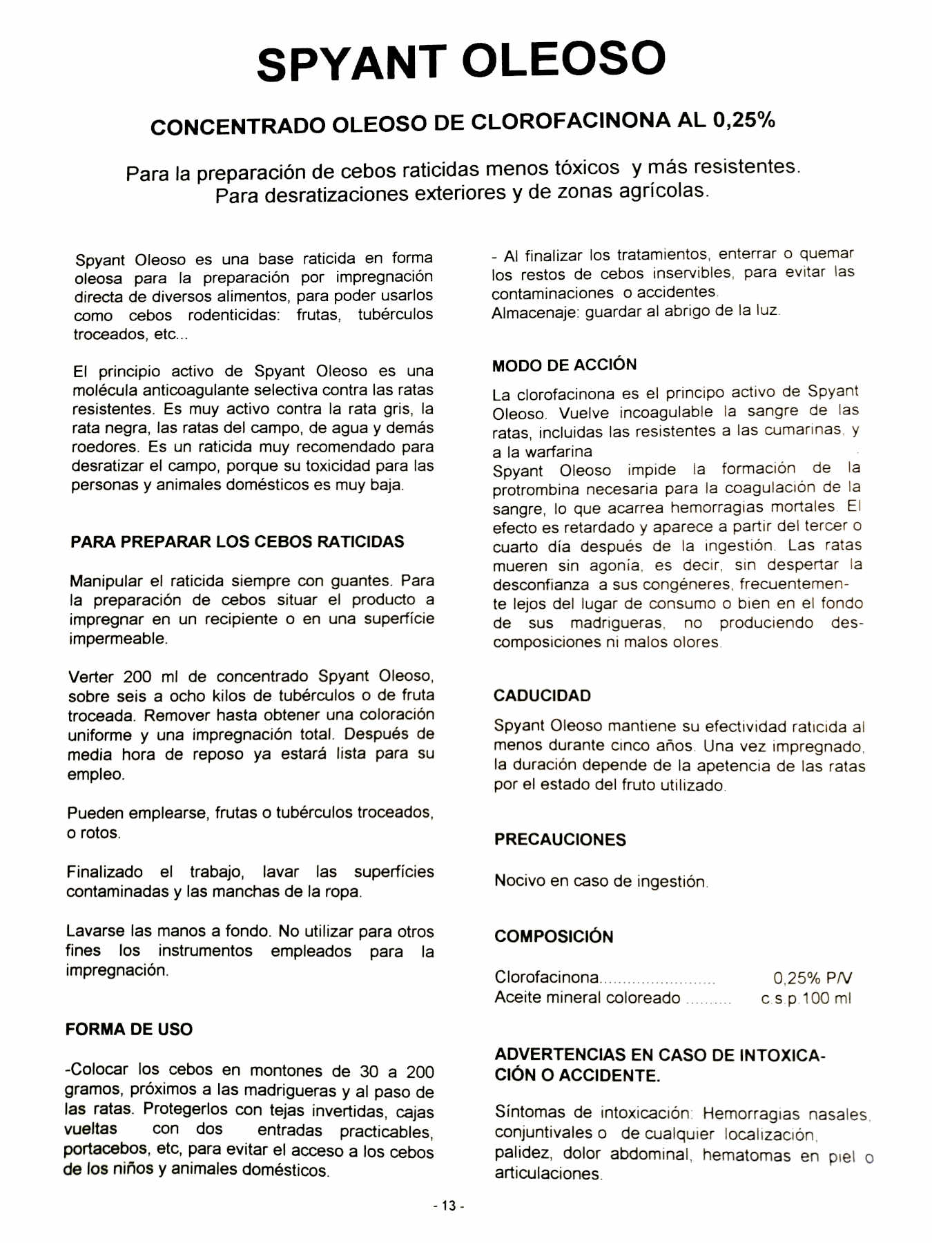 Según el catálogo de 2003, Spyant Oleoso estaba indicado para lo siguiente: «para la preparación por impregnación directa de diversos alimentos, para poder usarlos como cebos rodenticidas: frutas, tubérculos troceados, etc…» Recuerdo que en la primera empresa de control de plagas donde trabajé en 2004, el jefe de la delegación tenía un frasco pequeño de este producto para el caso de una rata que solo consumiera un producto y no tocara el rodenticida. Ahora bien, no recuerdo que lo tuviéramos que utilizar en ningún momento.