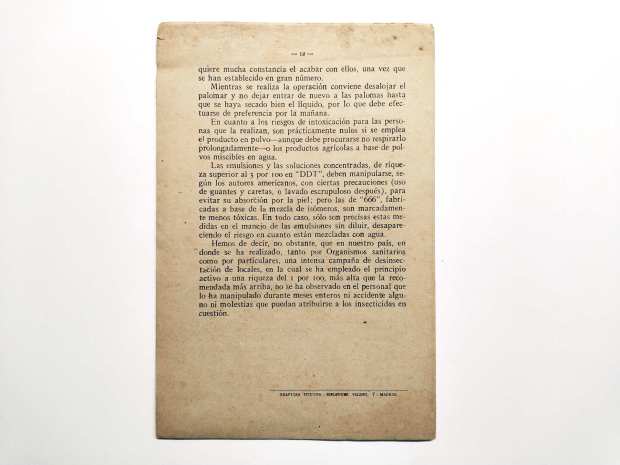 La última parte del opúsculo está dedicada a los medios de lucha contra los chinchorros. Estos consisten básicamente en los mismos que hoy en día, aplicación de insecticidas. Aunque en aquella época se circunscribían en los todopoderosos organoclorados DDT y 666, ampliamente utilizados en España en 1948, al poco de se comercializados hacia 1945. Para finalizar comentar que los dibujos de los chinchorros parecen del propio Gil Collado. En la hoja titulada ‘Las garrapatas de los perros’ de 1948 constan como propios los dibujos [4].