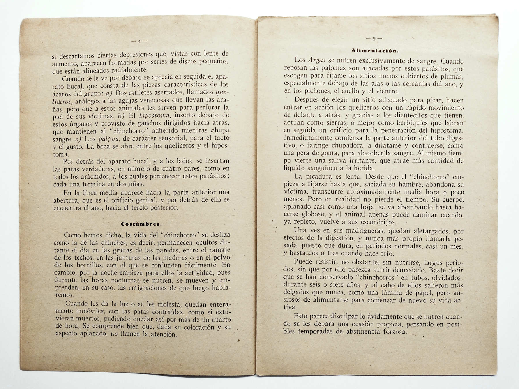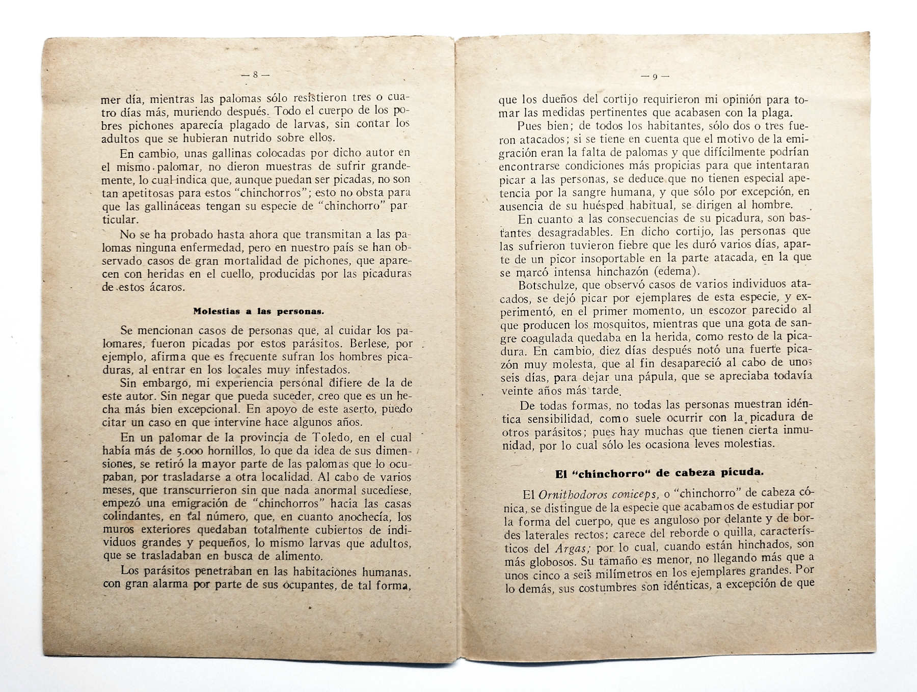 En el opúsculo se tratan dos especies, Argas reflexus y Ornithodoros coniceps. Al primero lo llama chinchorro común y al segundo chinchorro de cabeza picuda o chinchorro mediterráneo. Ambas especies parasitan a la paloma doméstica (Columba livia). Sin embargo, la segunda especie es escasa. En esta entrada reproduzco por orden todas sus páginas en imágenes. Pero también abajo he colocado un enlace para quien quisiera leer el texto en formato pdf, una digitalización disponible en la página web del Ministerio de Agricultura.