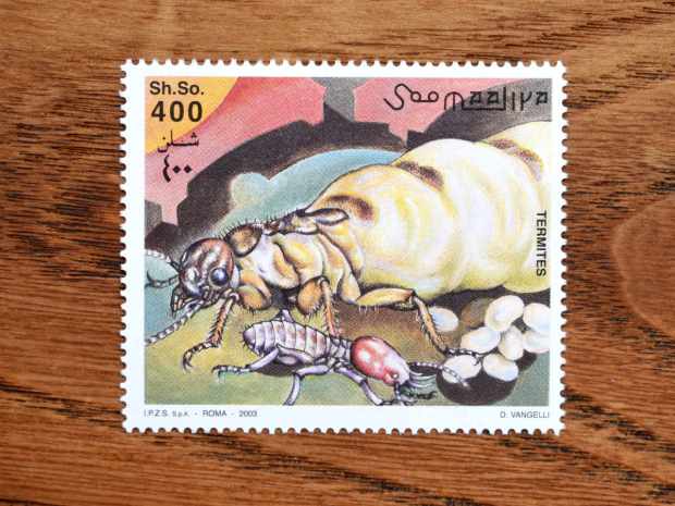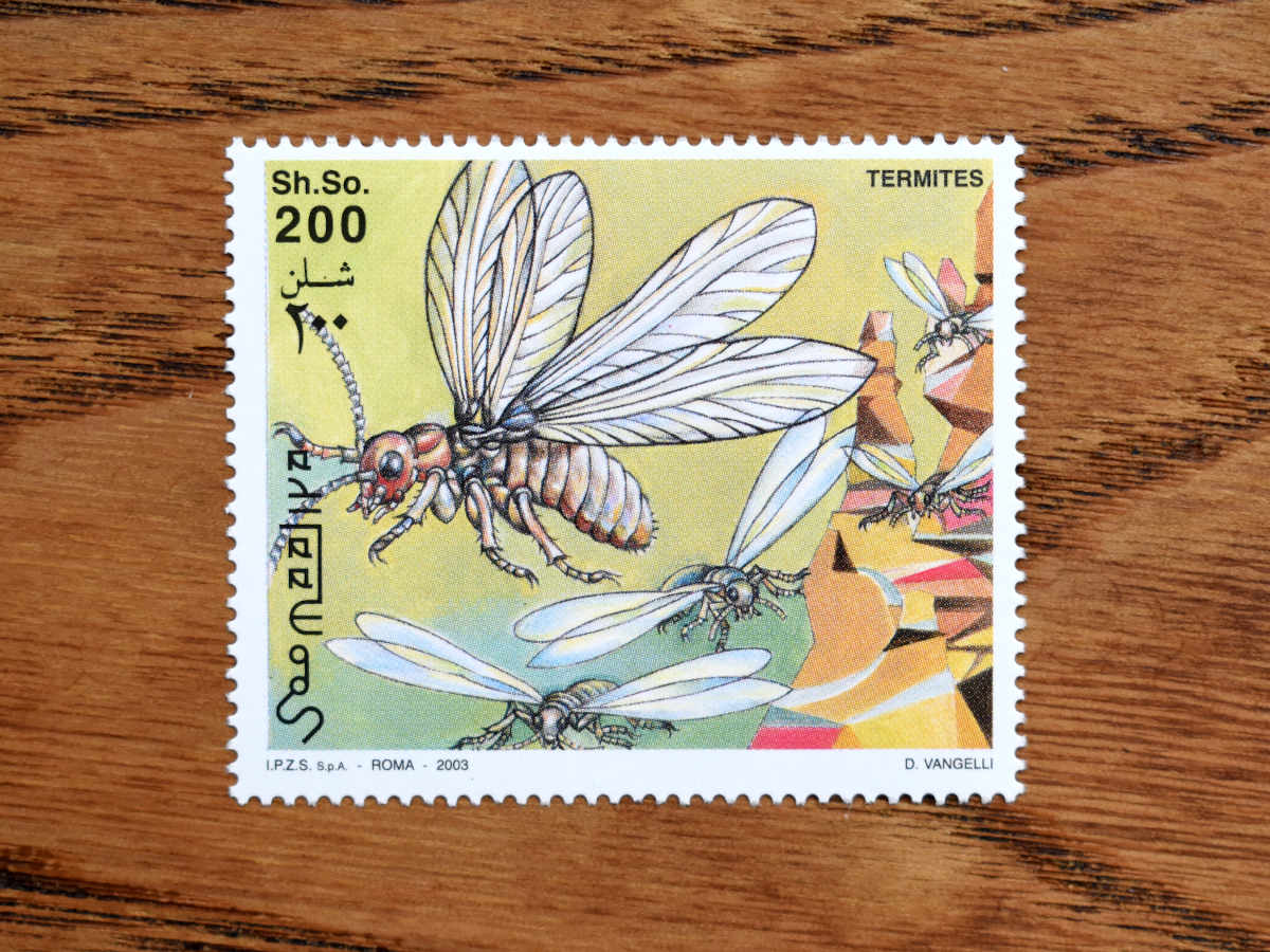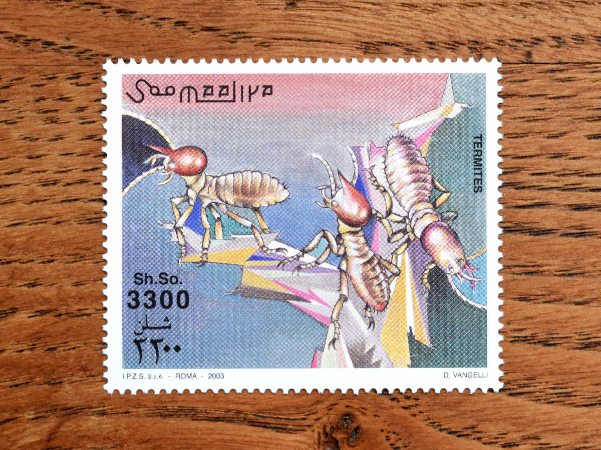 No es habitual encontrar sellos dedicados a estos insectos sociales. Las estampas no son reproducciones fotográficas, sino unos dibujos divertidos pero sin gran valor científico porque no son fidedignos. El autor habrá querido retratar aspectos característicos de las termitas. En el sello de más valor, de 3.300 chelines somalíes (figura 3), se pueden ver tres soldados. Dos de ellos pertenecerían a alguna especie de la subfamilia Nasutitermitinae y otro a una especie que desconozco. Entiendo que el autor habrá querido reproducir dos especies habituales de Somalia. En el sello de 400 chelines (figura 4), se puede ver una reina, huevos y un soldado de esta especie desconocida. Y en el sello de 200 chelines (figura 5), se representa uno de los momentos más importantes en la vida de una colonia de termitas, la enjambrazón o vuelo de reproductores. La salida de miles de termitas aladas es además un momento espectacular que causa impresión en quienes desconocen estos insectos.