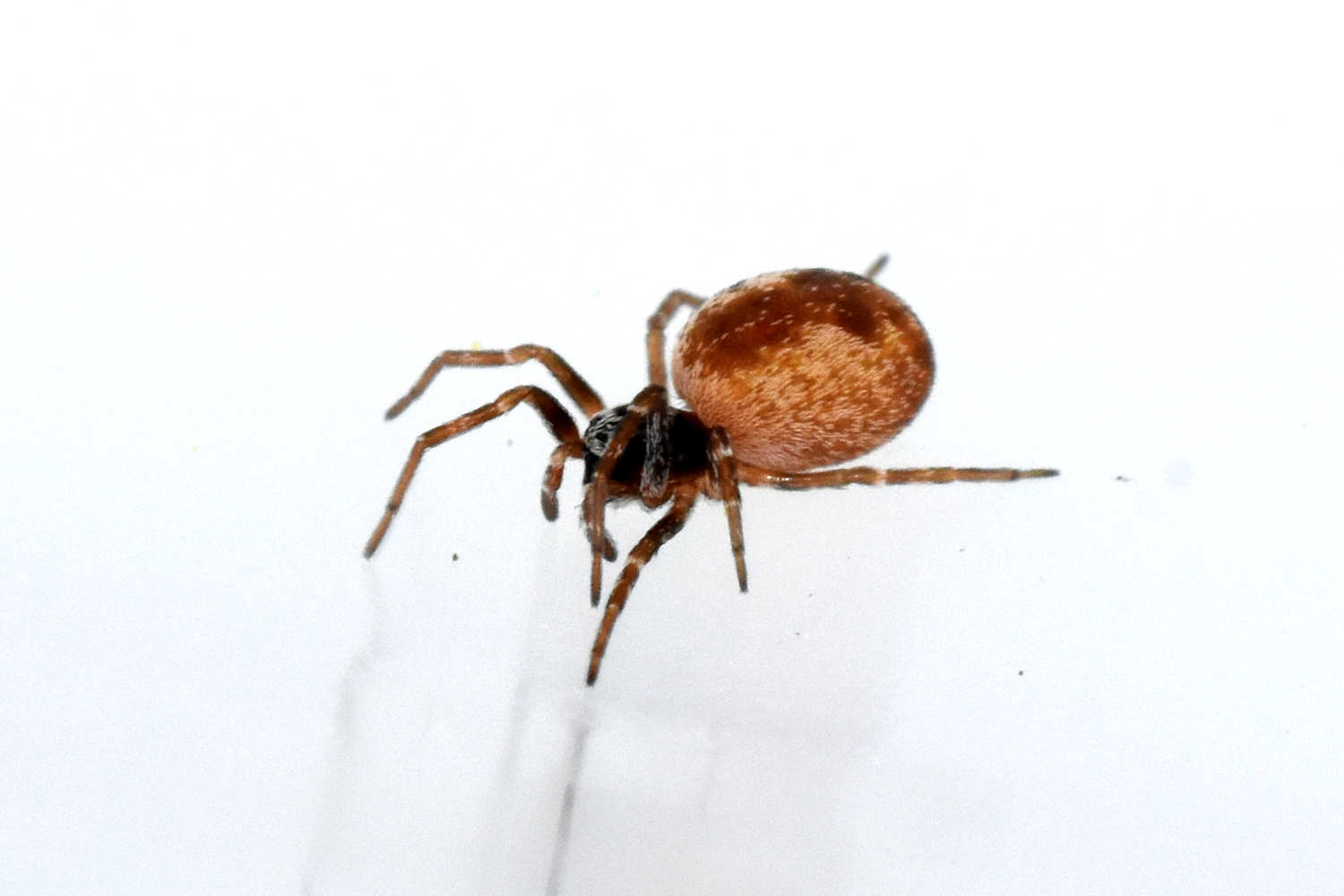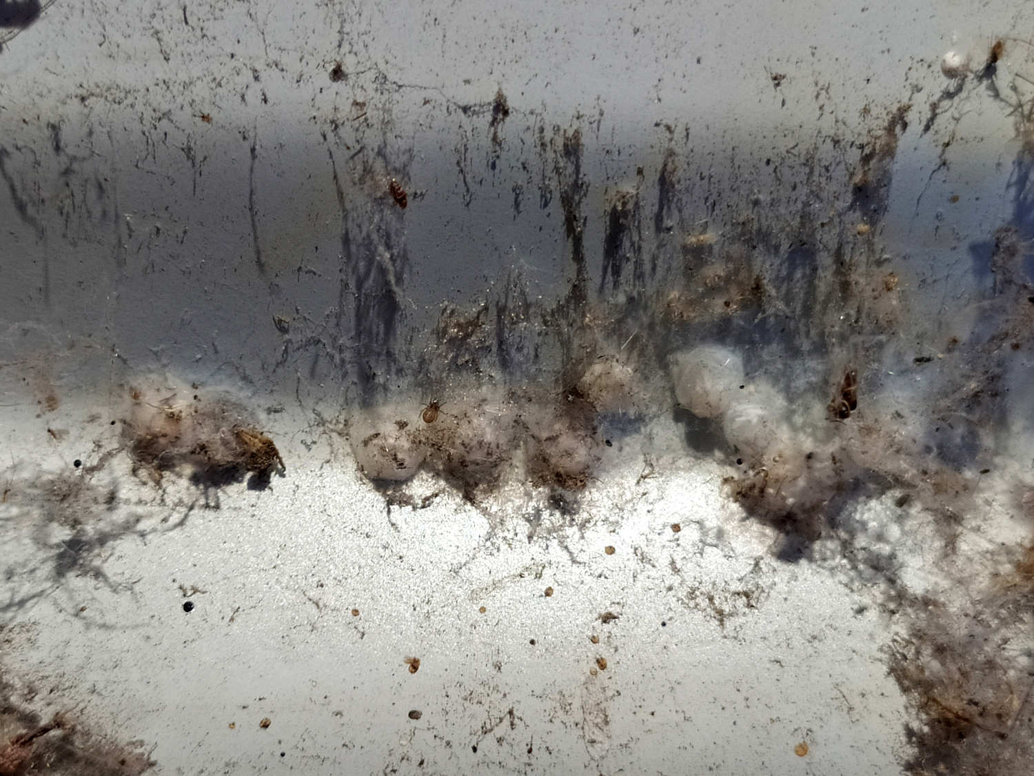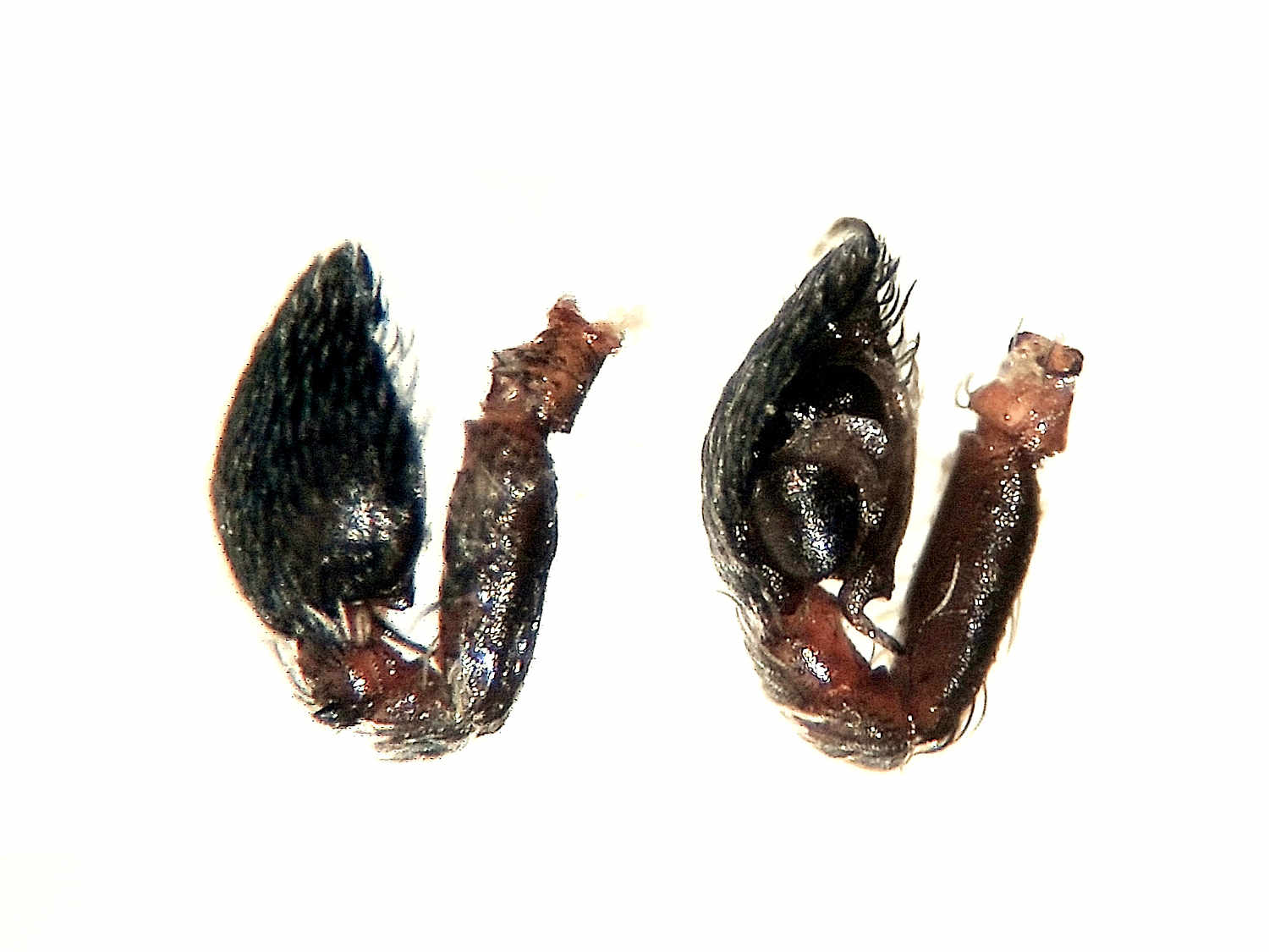 En el almacén, la especie de araña que más abundaba era Holocnemus pluchei [1]. Se trata de una araña de patas largas que se parece a Pholcus phalangioides, una especie habitual que encuentro en viviendas. H. pluchei también se encontraba cerca de los aparatos insectocaptores. Pero en aquellos aparatos situados cerca de paredes rugosas, abundaba la araña Brigittea civica (=Dictyna civica). Es una especie muy interesante de la cual ya he dado cuenta en una entrada anterior donde mostré el pilar de un puente lleno de esta especie [2]. Se trata de una pequeña araña de entre 2’3 y 3’5 mm de longitud [3]. El macho y la hembra son similares en longitud, pero difieren en la forma. No es fácil la identificación de esta especie, ya que se puede confundir con otras similares del género Dictyna. Para ello, lo mejor es capturar un macho y observar los pedipalpos con la lupa binocular (figura 17).