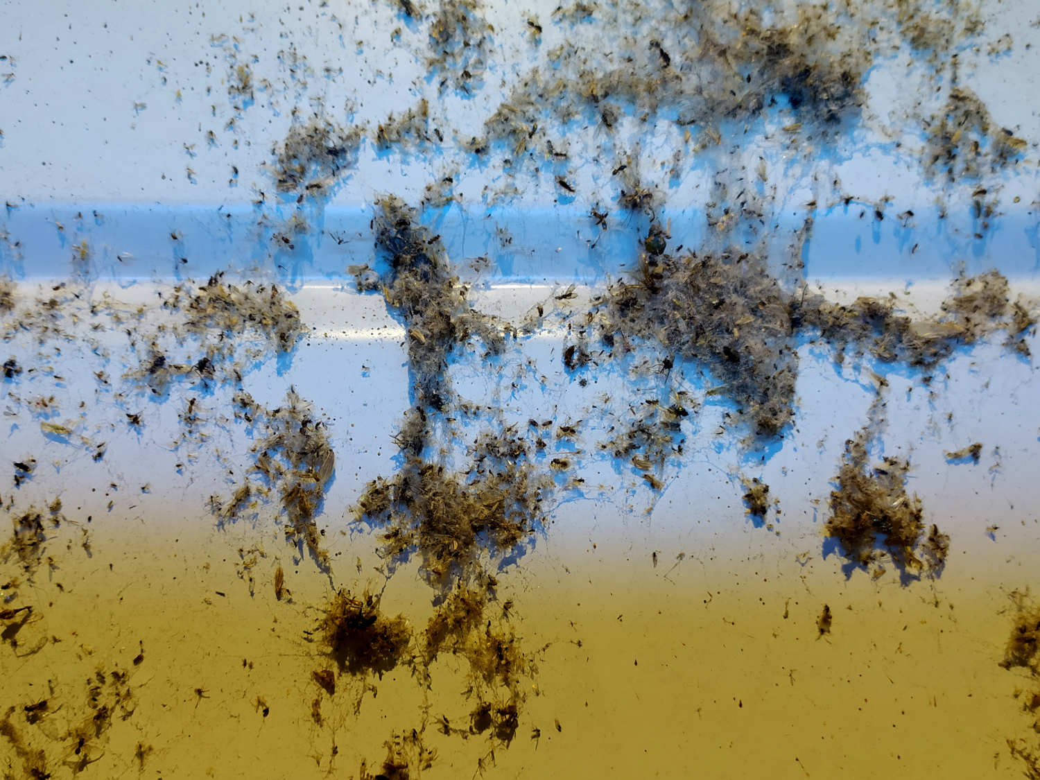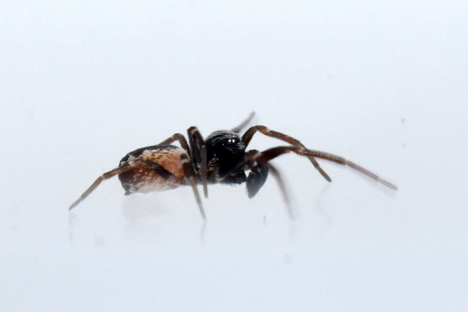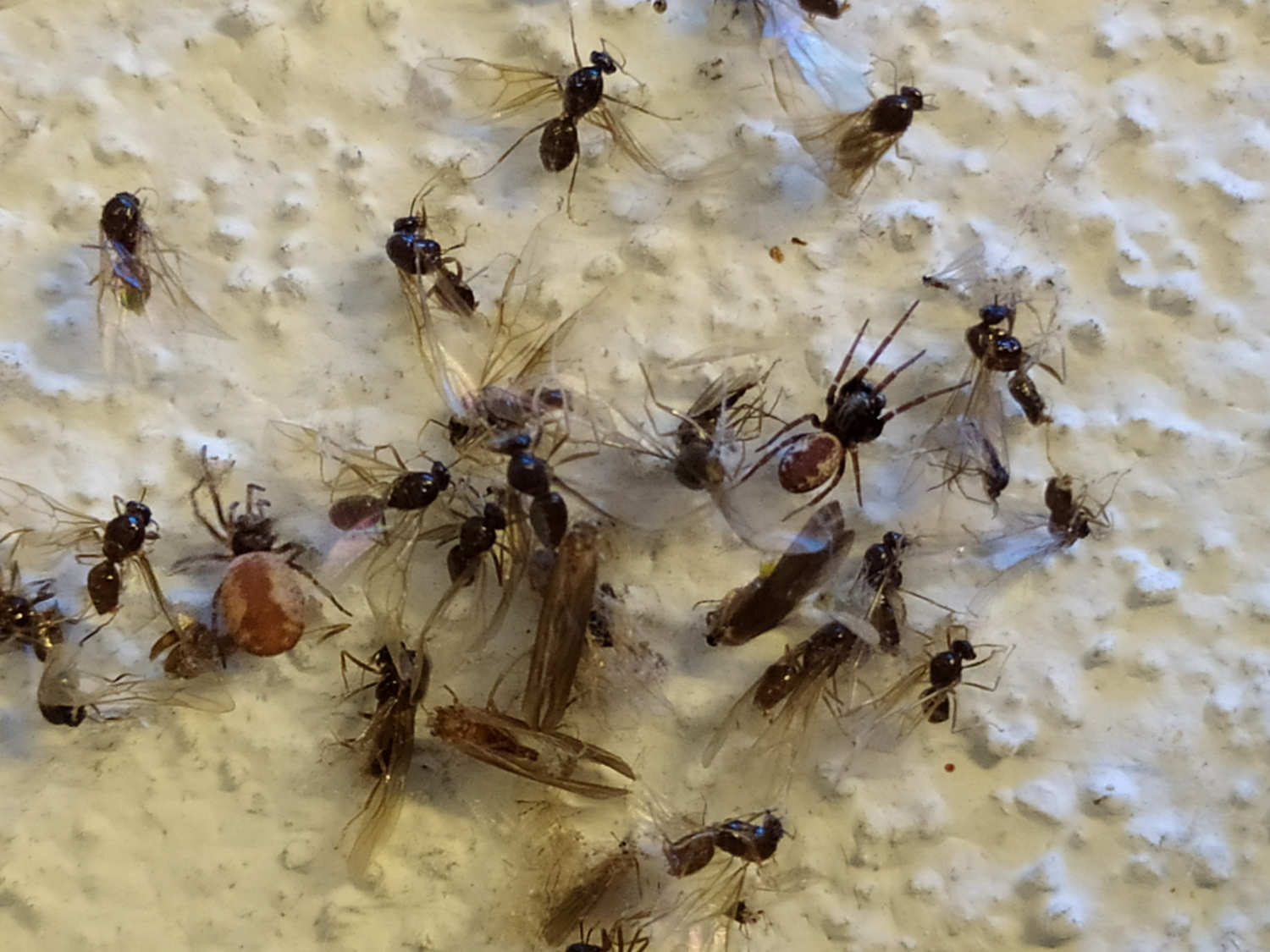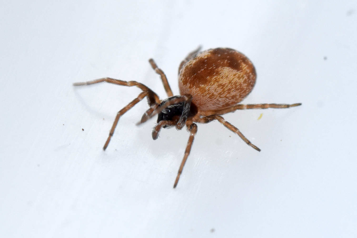 En el almacén, la especie de araña que más abundaba era Holocnemus pluchei [1]. Se trata de una araña de patas largas que se parece a Pholcus phalangioides, una especie habitual que encuentro en viviendas. H. pluchei también se encontraba cerca de los aparatos insectocaptores. Pero en aquellos aparatos situados cerca de paredes rugosas, abundaba la araña Brigittea civica (=Dictyna civica). Es una especie muy interesante de la cual ya he dado cuenta en una entrada anterior donde mostré el pilar de un puente lleno de esta especie [2]. Se trata de una pequeña araña de entre 2’3 y 3’5 mm de longitud [3]. El macho y la hembra son similares en longitud, pero difieren en la forma. No es fácil la identificación de esta especie, ya que se puede confundir con otras similares del género Dictyna. Para ello, lo mejor es capturar un macho y observar los pedipalpos con la lupa binocular (figura 17).