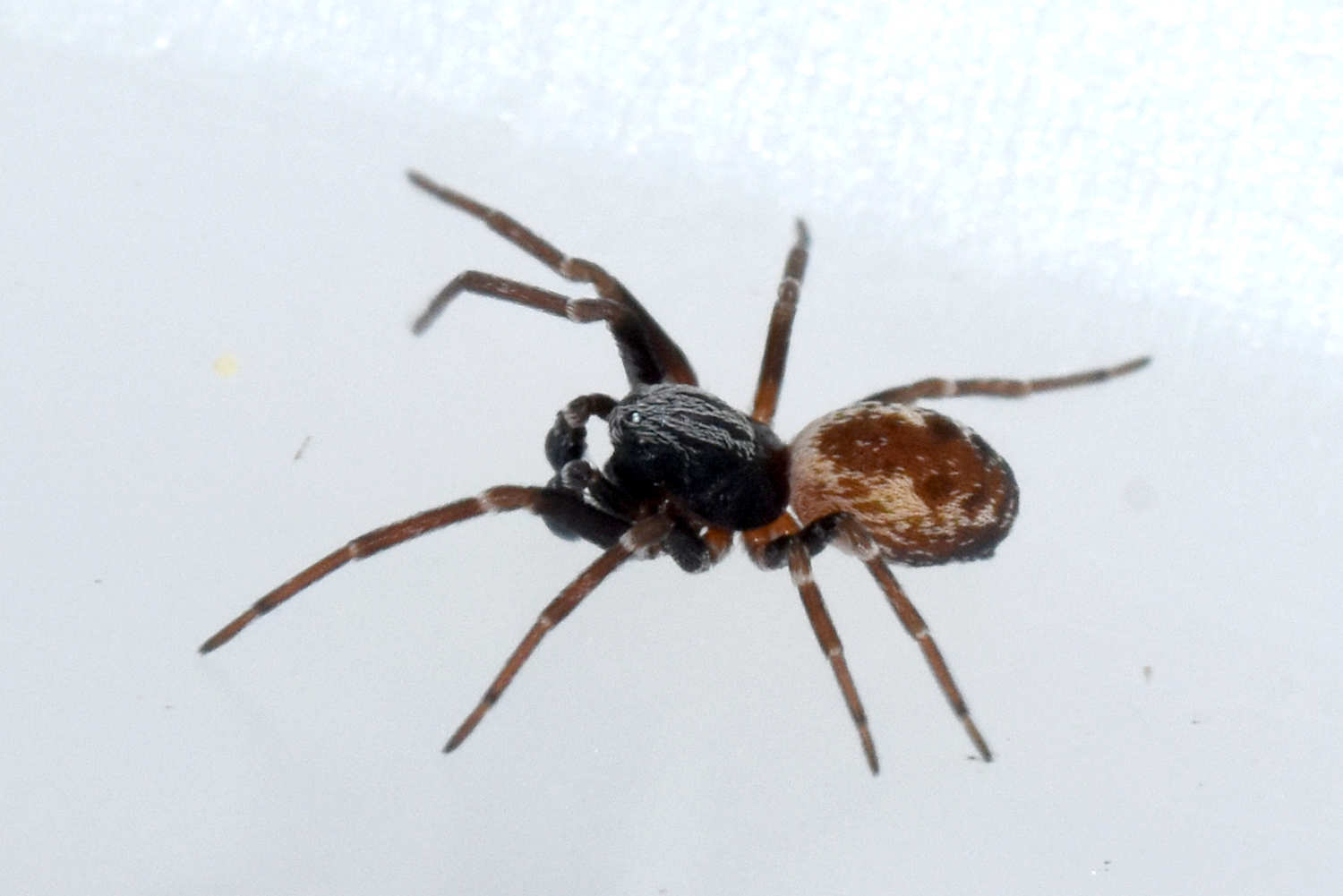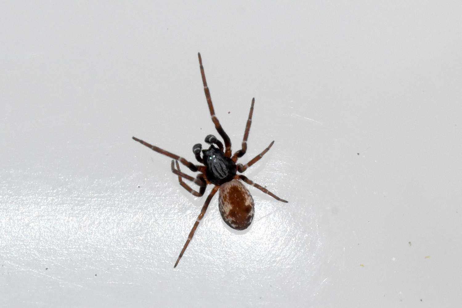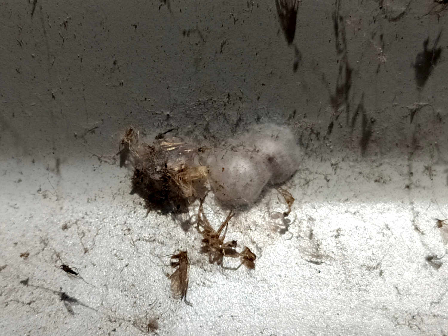 Las paredes tienen un aspecto moteado de manchas oscuras por las telarañas de B. civica. Y aquellas paredes con mucha presencia tienen un aspecto sucio y descuidado. La telaraña es plana, irregular y tupida detrás de la cual se esconde la araña. La telaraña es sucia, ya que se encuentra llena de presas y polvo que se va acumulando. Ahora bien, existen otras especies que construyen una telaraña similar sobre paredes como es el caso de Oecobius navus de la que di cuenta en hace unos años en una entrada [3]. Esta araña es de un tamaño similar a B. civica. Hay que apuntar que sobre una misma pared podemos encontrar ambas especies conviviendo.