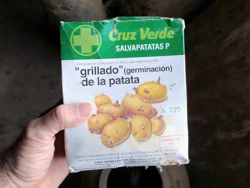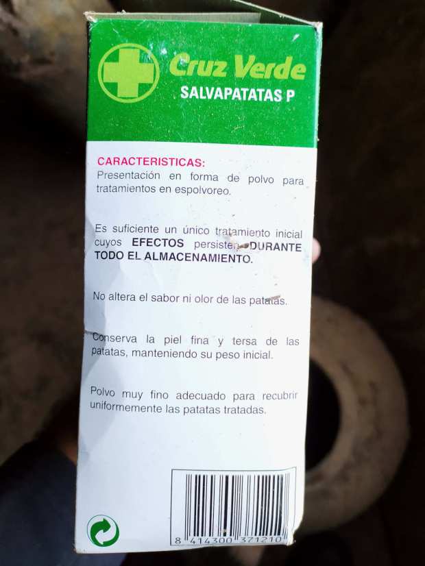 En un rincón vi un envase de 1 kilo del Salvapatatas P de Cruz Verde SA, producto contra el grillado de la patata (figura 1). Recuerdo de pequeño ver en el pueblo de mi abuela las patatas cubiertas de polvos blancos. Y como curioso que soy en una ocasión pregunté  por estos polvos a un hortelano al que fuimos a comprar melones. Recuerdo que en una esquina del cobertizo había una montaña de patatas generosamente cubierta de polvos. Me dijo que eran para que no se grillaran las patatas. Es probable que esta persona hubiera aplicado Salvapatatas de Cruz Verde o un producto similar de otra marca.