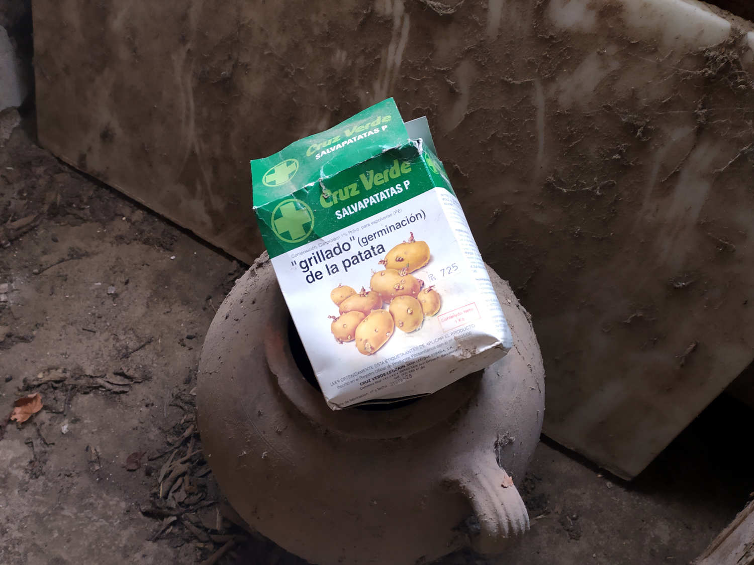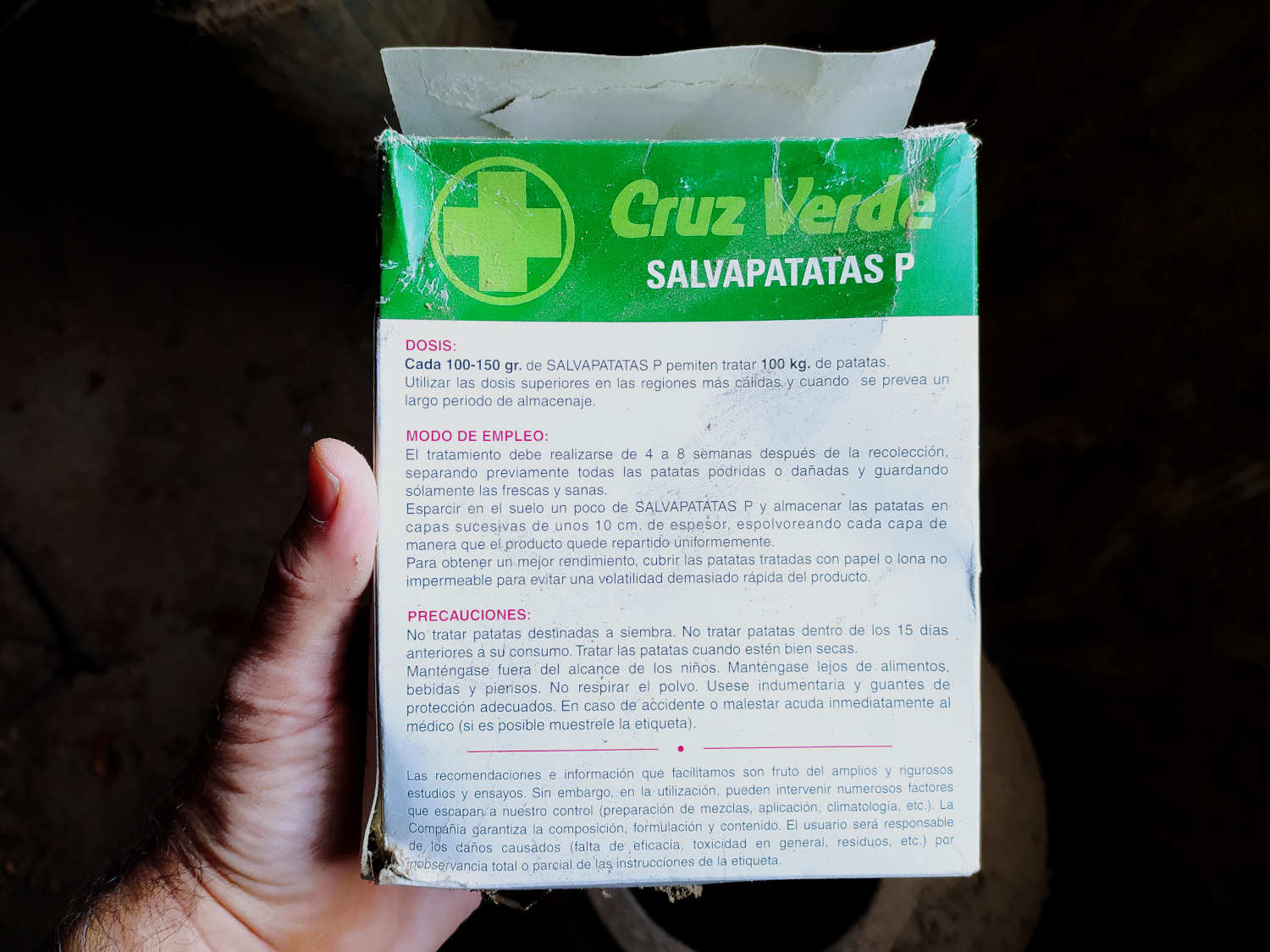 En un rincón vi un envase de 1 kilo del Salvapatatas P de Cruz Verde SA, producto contra el grillado de la patata (figura 1). Recuerdo de pequeño ver en el pueblo de mi abuela las patatas cubiertas de polvos blancos. Y como curioso que soy en una ocasión pregunté  por estos polvos a un hortelano al que fuimos a comprar melones. Recuerdo que en una esquina del cobertizo había una montaña de patatas generosamente cubierta de polvos. Me dijo que eran para que no se grillaran las patatas. Es probable que esta persona hubiera aplicado Salvapatatas de Cruz Verde o un producto similar de otra marca.