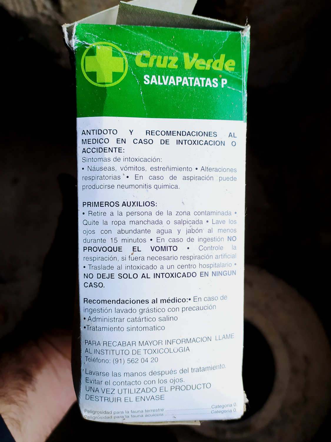 Respecto al envase de las imágenes, fue adquirido en los años 2000 o 2001. Por un lado, consta el número 18835/00 del Registro Oficial de Productos Fitosanitarios del Ministerio de Agricultura. Los dos ceros después de la barra indican que el producto fue registrado (o renovado su registro) en el año 2000. Y por otro, aparece el precio de 725 pesetas. Como sabemos, en enero de 2002 fue introducido el euro en Europa.