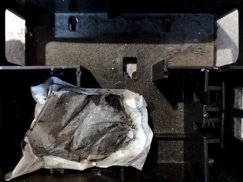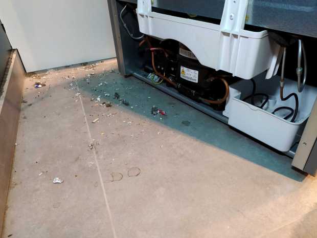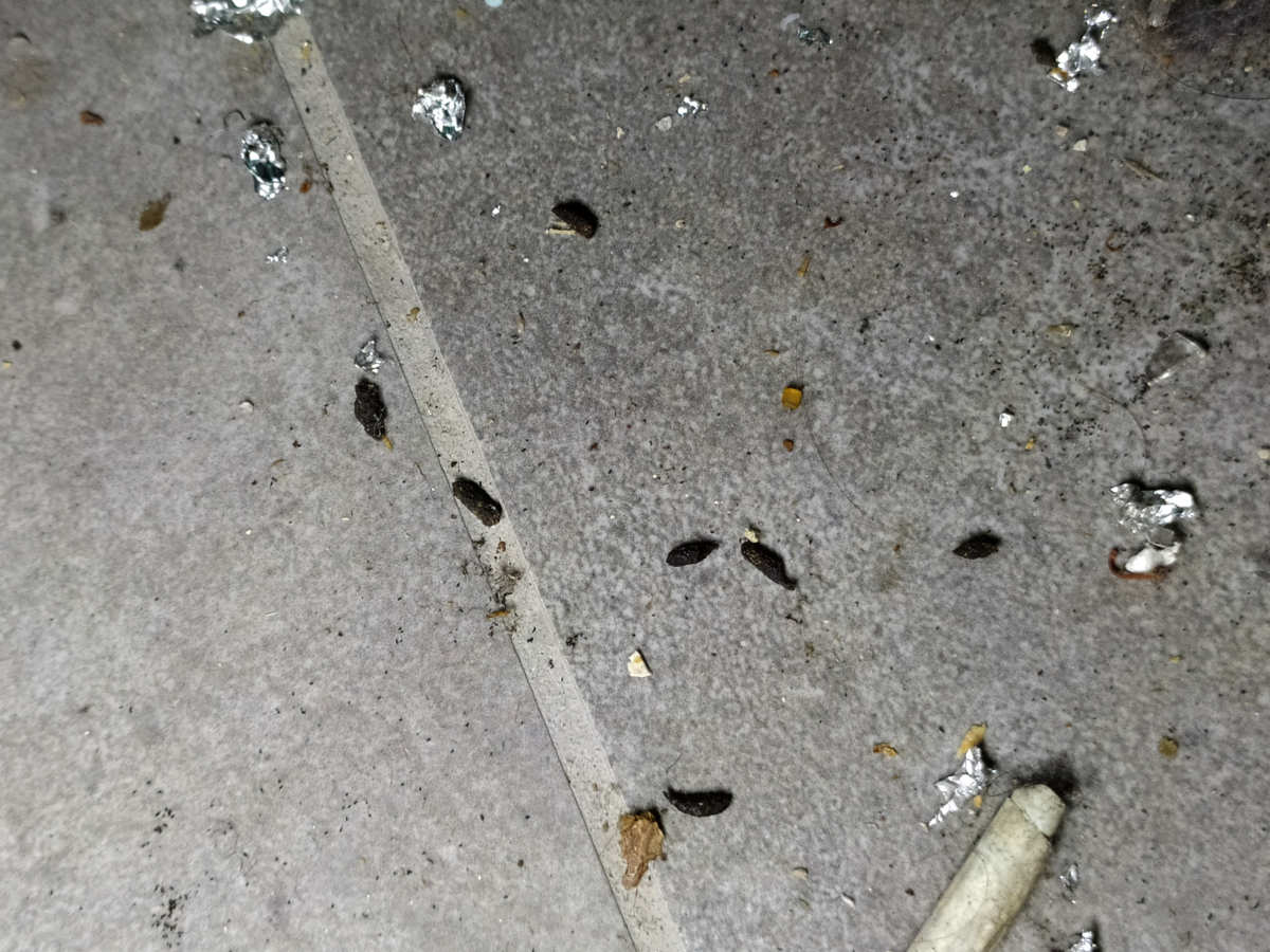 En esta entrada se pueden ver imágenes de una sencilla desratización llevada a cabo contra un solo ratón doméstico (Mus musculus). Fue visto en el comedor de unas instalaciones industriales. Se pensó que podrían haber más, pero la inspección realizada hizo ver que lo más probable fuera un solo individuo. Por un lado, la cocina estaba en un lugar alejado del suelo. En esas instalaciones no se había visto ningún ratón en los dos años que llevaban abiertas. Y al retirar la nevera, se encontraron pocos excrementos (figuras 4 y 5). De haber sido más, se habrían acumulado bastantes más. Hasta que fue visto, el ratón debía llevar días accediendo al comedor.